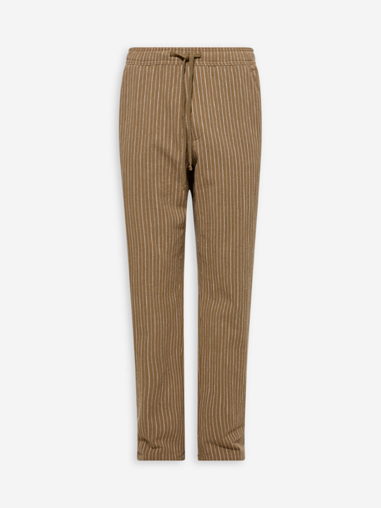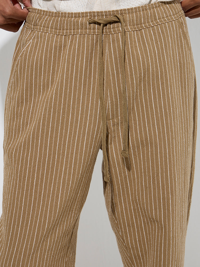 ETA launches these mustard chinos showcasing stripe prints. Woven from a cotton-rich fabric in a relaxed silhouette. they feature an elasticated waistband with adjustable drawstrings and multiple pockets for everyday convenience.