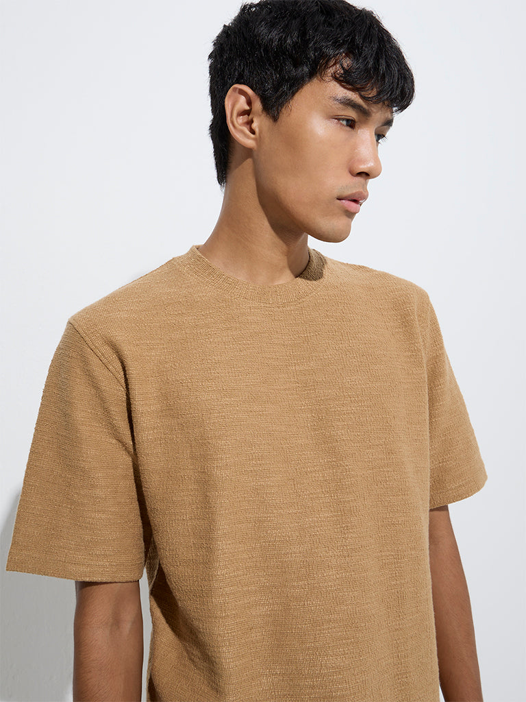 Add a touch of texture to your casual lineup with this mustard t-shirt from ETA. Crafted from a rich cotton-blend. it features a relaxed frame with a round neckline and half sleeves. making it a versatile pick for everyday wear.