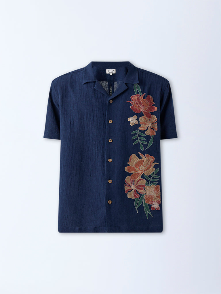 ETA Navy Floral Embroidered Relaxed-Fit Cotton Shirt