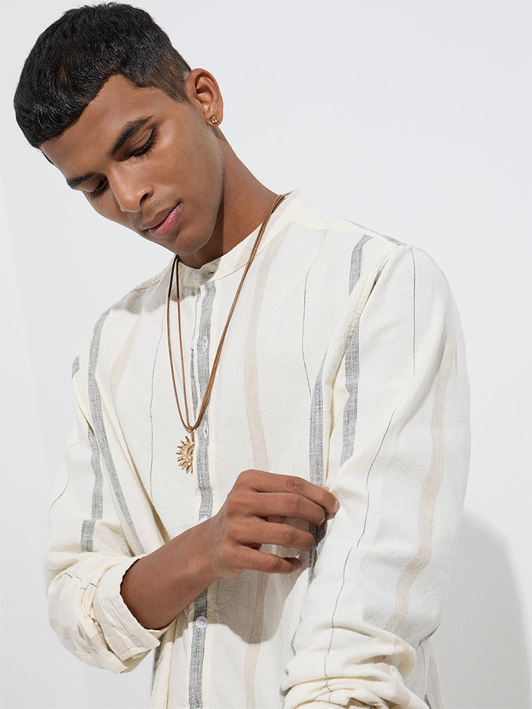Defined with striped prints. this off-white shirt from ETA is tailored in a relaxed silhouette for effortless wear. Its cotton-linen blend ensures superior comfort. while the band collar. button placket. and full sleeves lend a polished finish.