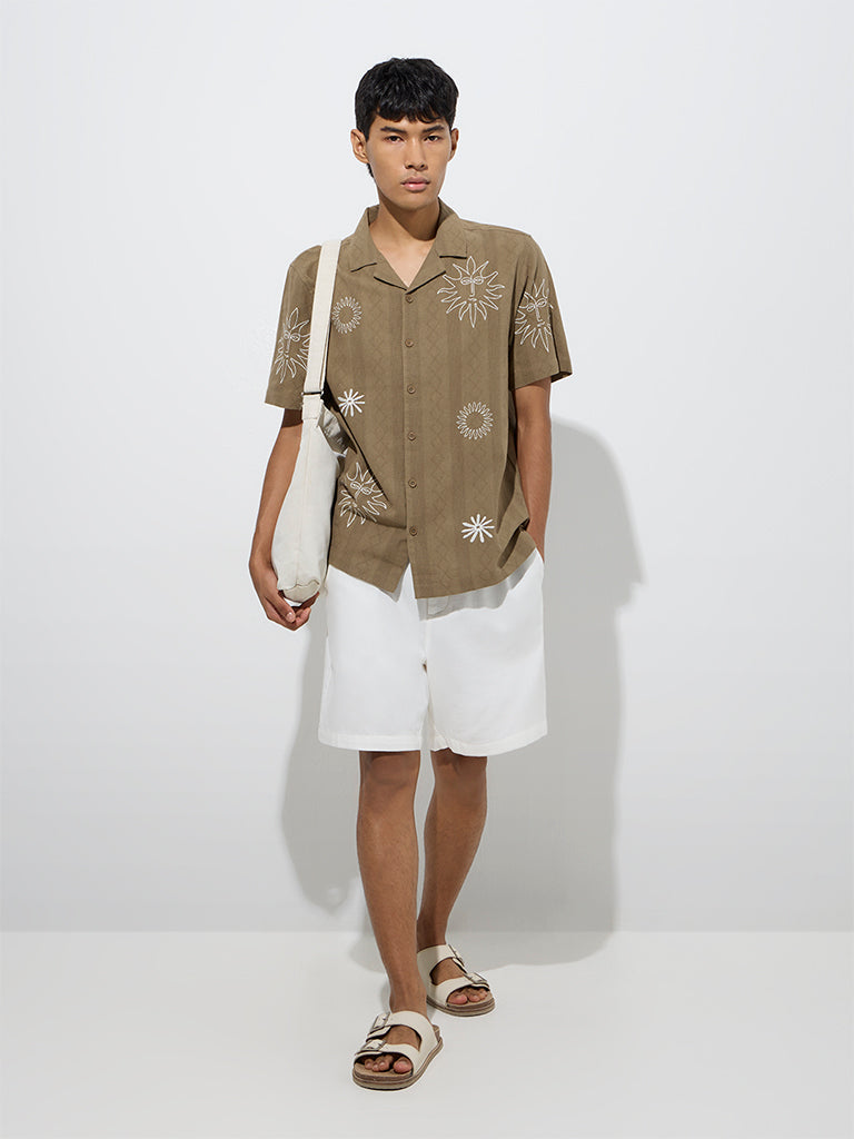 Embroidered with sun motifs. this olive shirt from ETA brings a subtle touch of detail to your casual rotation. It’s cut from pure cotton and shaped in a relaxed fit for maximum comfort. A camp collar. half sleeves. and a clean button placket complete the look.