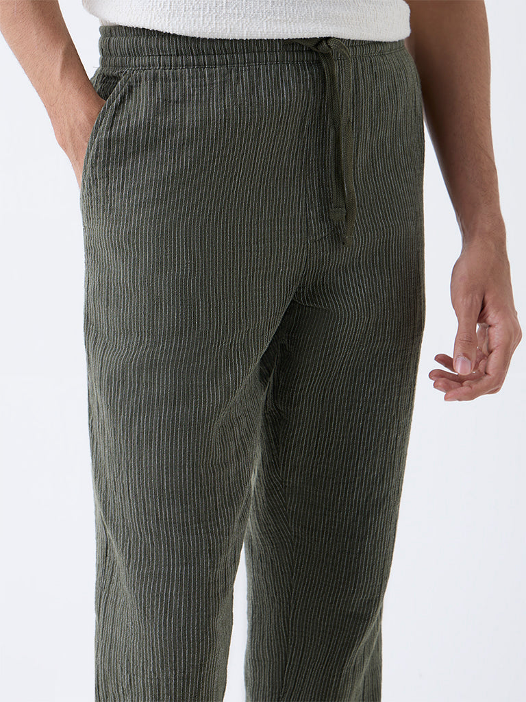 These olive pinstriped cotton pants from ETA combine laid-back comfort with subtle sophistication. Designed in a relaxed mid-rise silhouette. they feature a smooth elastic waistband with adjustable drawstrings and multiple pockets??perfect for effortless. everyday wear.