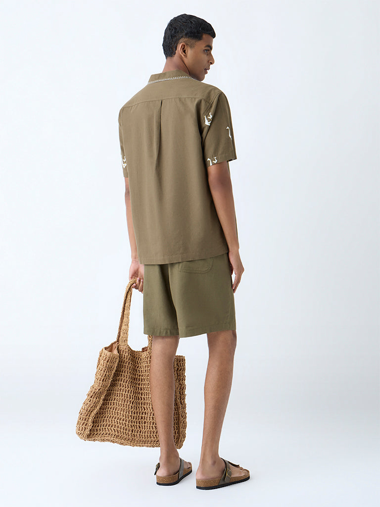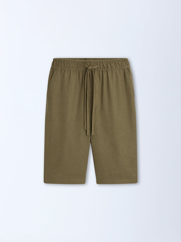 These olive shorts by ETA are made for days when you want to move freely. run errands. or soak up the sun. Woven from a breathable fabric in a relaxed handle. they feature an elasticated waistband with adjustable drawstrings. and multiple pockets for effortless practicality.