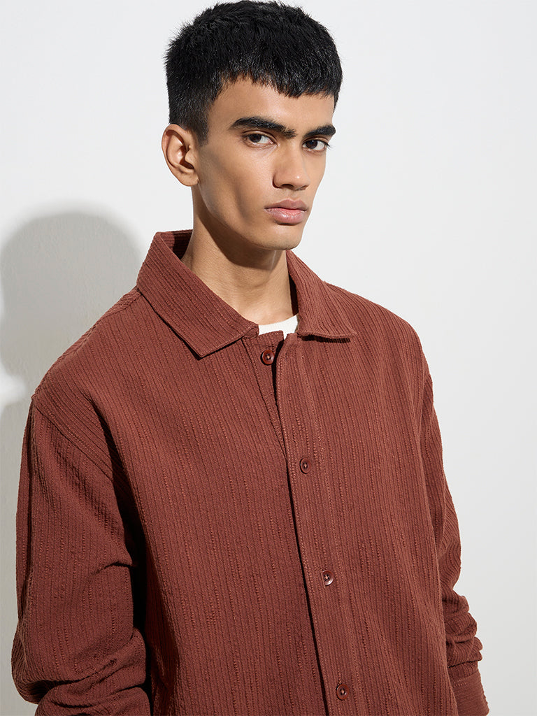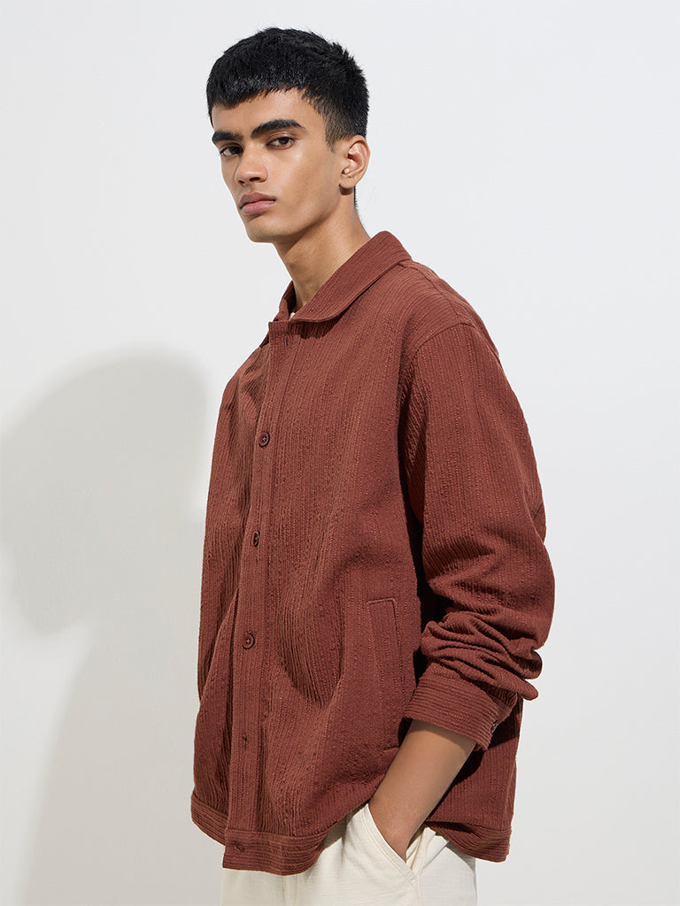 This rust jacket from ETA showcases a self-striped pattern for a textured appeal. Milled from pure cotton in a relaxed frame. it features a spread collar. a button placket. full sleeves. and welt pockets ?? blending comfort with everyday sophistication.