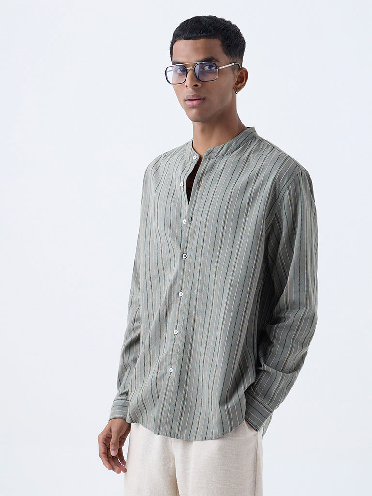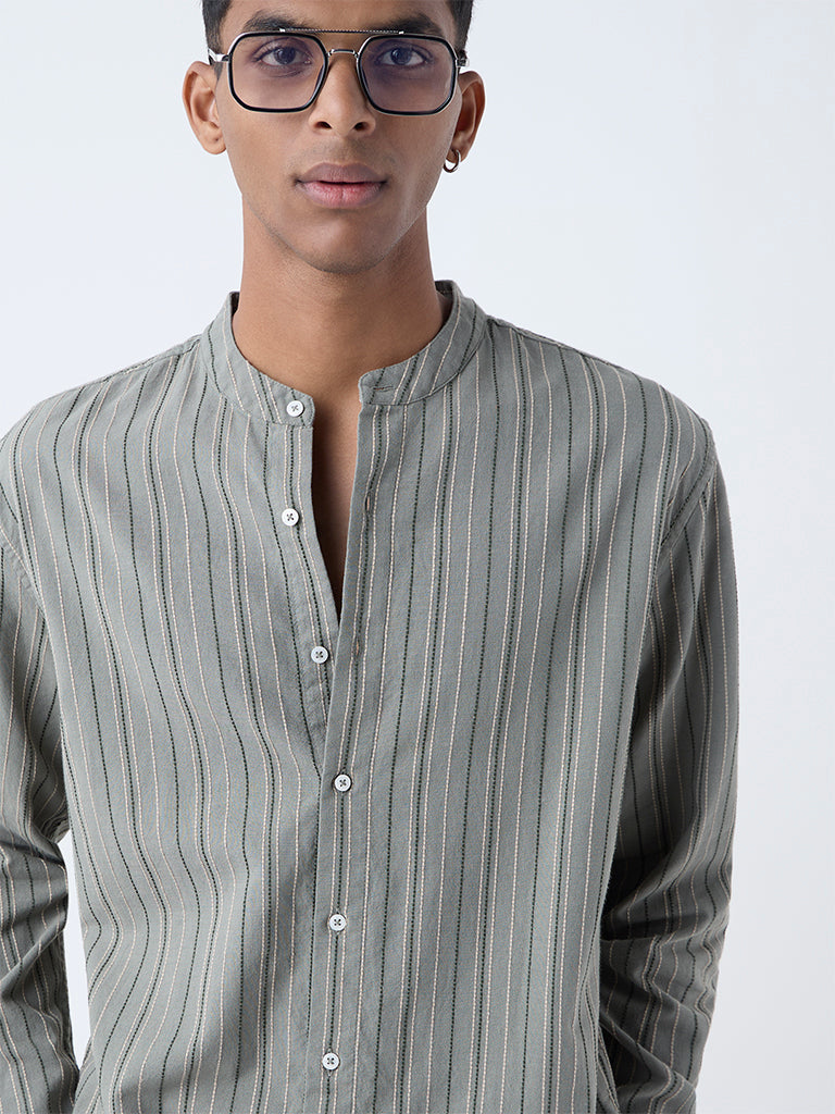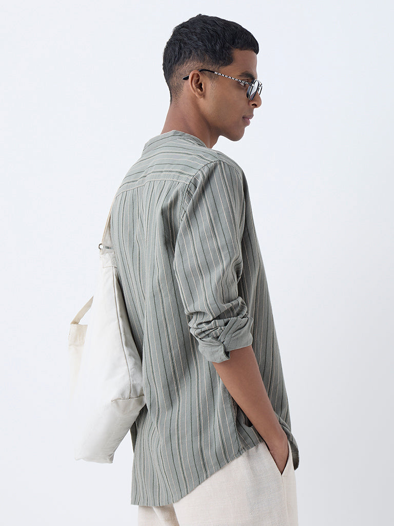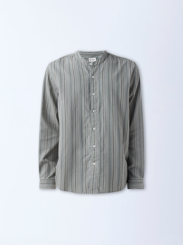 ETA introduces this sage shirt showcasing stripe patterns on a cotton-rich fabric base. Designed in a relaxed-fit silhouette. it features a mandarin collar. a button-up front and full sleeves. A polished essential that brings ease and refinement to dressed-up casual looks.