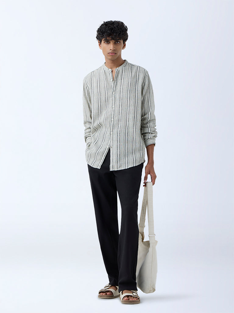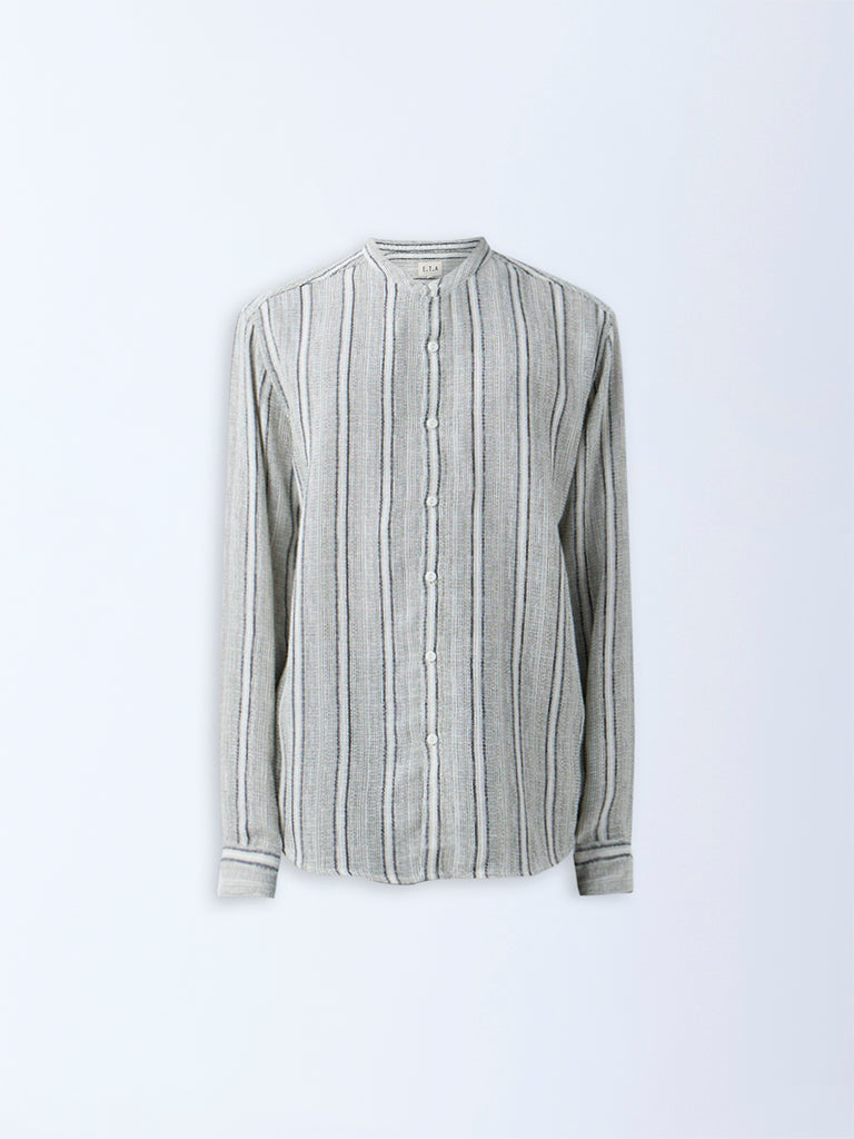This sage shirt from ETA is decked with stripe embroidery that adds understated depth to its design. Woven from a knit-textured fabric and cut in a resort-fit silhouette. it is styled with a band collar. full sleeves. and a button placket for ease of wear.