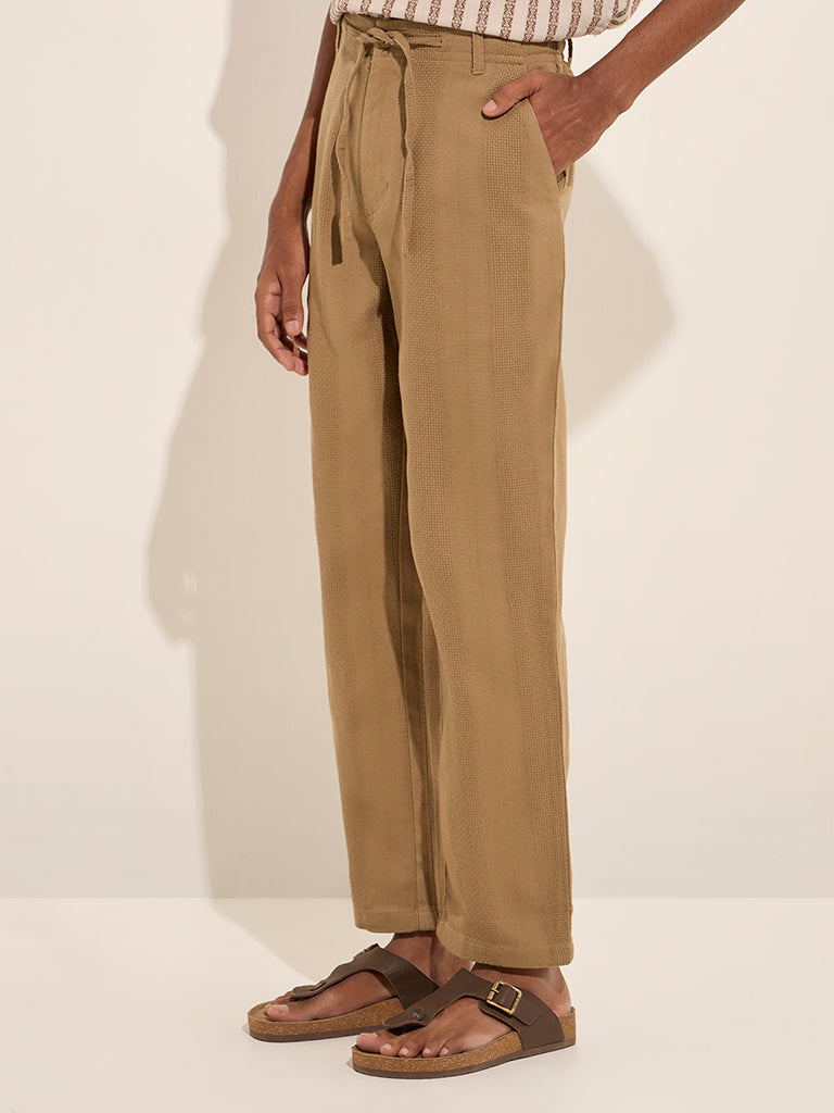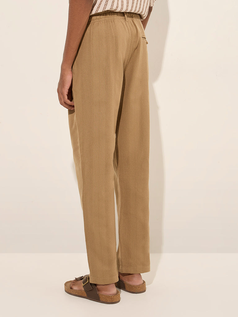 These taupe relaxed-fit chinos from ETA are designed with self detailing. Made from a cotton-linen blend. the mid-rise pair offers an elasticated waistband with drawstrings. button-zipper fly. belt loops. and multiple pockets.