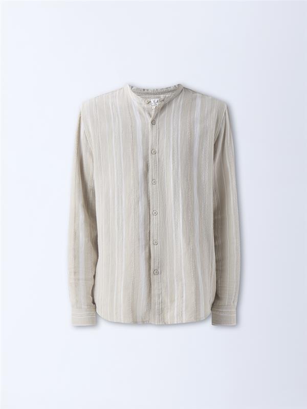 ETA presents this taupe shirt. constructed from a premium-blend fabric for all-day comfort. Featuring stripe patterns on a relaxed-fit shape. it is styled with a band collar. button-up front and full sleeves. A refined essential that pairs easily with understated style.
