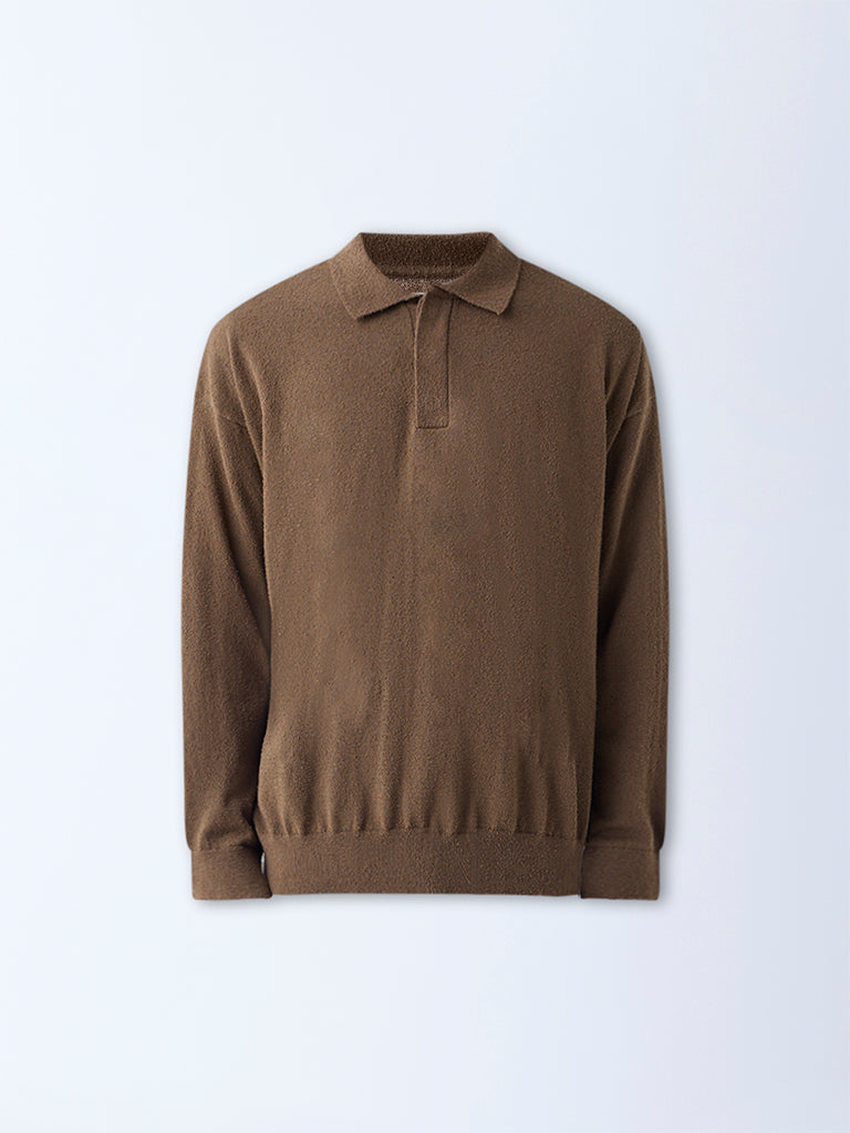 ETA Taupe Textured Relaxed-Fit Cotton-Blend Polo Sweater