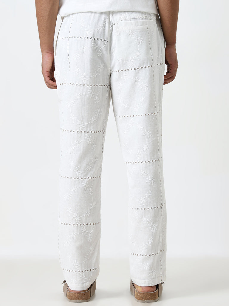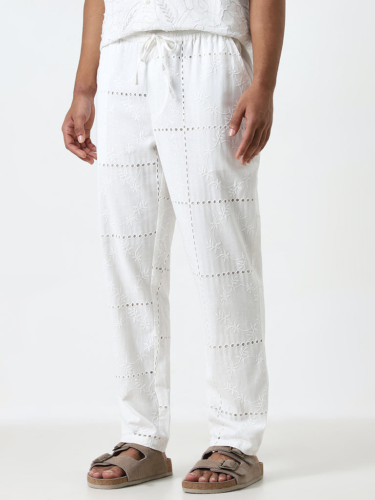 ETA launches these white chinos featuring floral designs and schiffli prints. Crafted from a breathable fabric. the mid-rise bottom wear offers a relaxed-fit. The elasticated waistband. adjustable drawstrings and multiple pockets complete it.