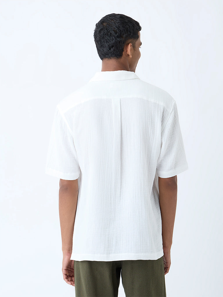 Bring breezy sophistication to your summer wardrobe with this white shirt from ETA. Showcasing floral and paisley embroidery on a crinkle-textured fabric. it is tailored in a relaxed silhouette for effortless ease. Styled with a camp collar. button placket. and short sleeves. this versatile piece merges contemporary design with casual comfort.