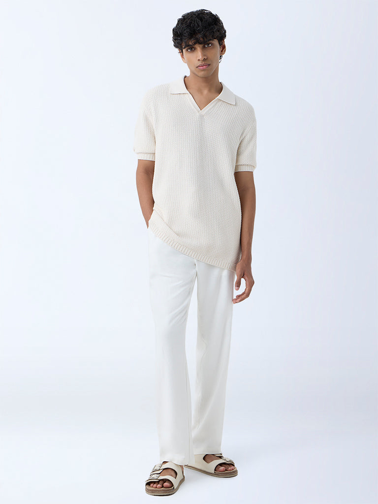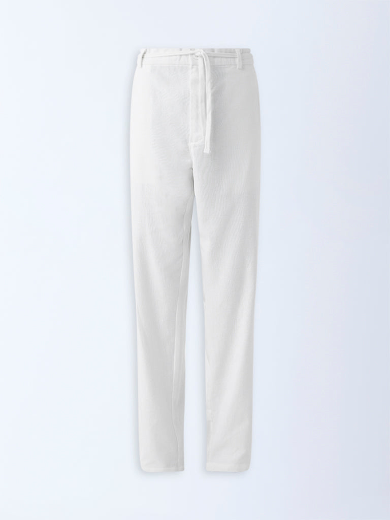 These off-white chinos from ETA are woven from cotton-blend fabric for optimal comfort. Structured in a relaxed frame. they are fitted with an elasticated waist. a button-zipper fly. and adjustable drawstrings for a secure fit. Finished with multiple pockets. this stylish pair brings poise and convenience for casual styling.