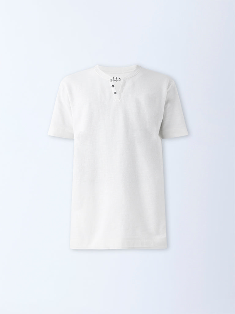 A fresh take on a wardrobe classic. this white tee from ETA blends simplicity with subtle detail. Spun from pure cotton. it features a round neck with a V-cut illusion and three-button placket that adds quiet character. Finished with short sleeves. it delivers an easy-going look for everyday wear.