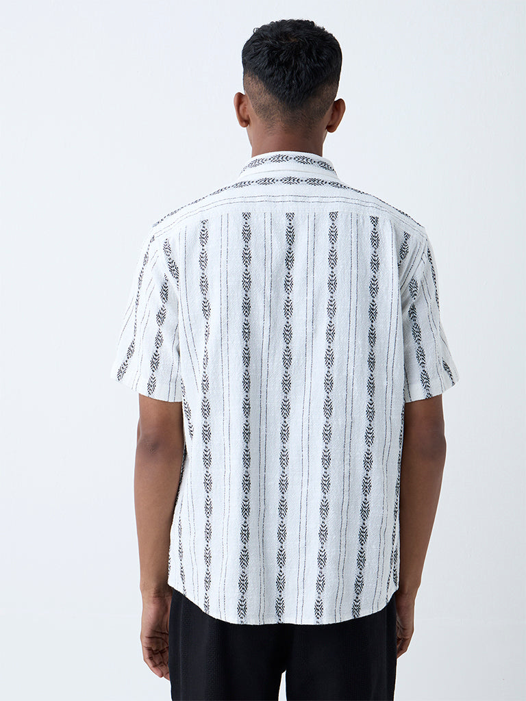 This white shirt from ETA blends understated detailing with relaxed tailoring. Fashioned with embroidered stripes. it brings just the right amount of texture to everyday ensembles. The lightweight fabric keeps things breezy. while the classic collar. short sleeves. and button-up front make it an easy choice for effortless styling.