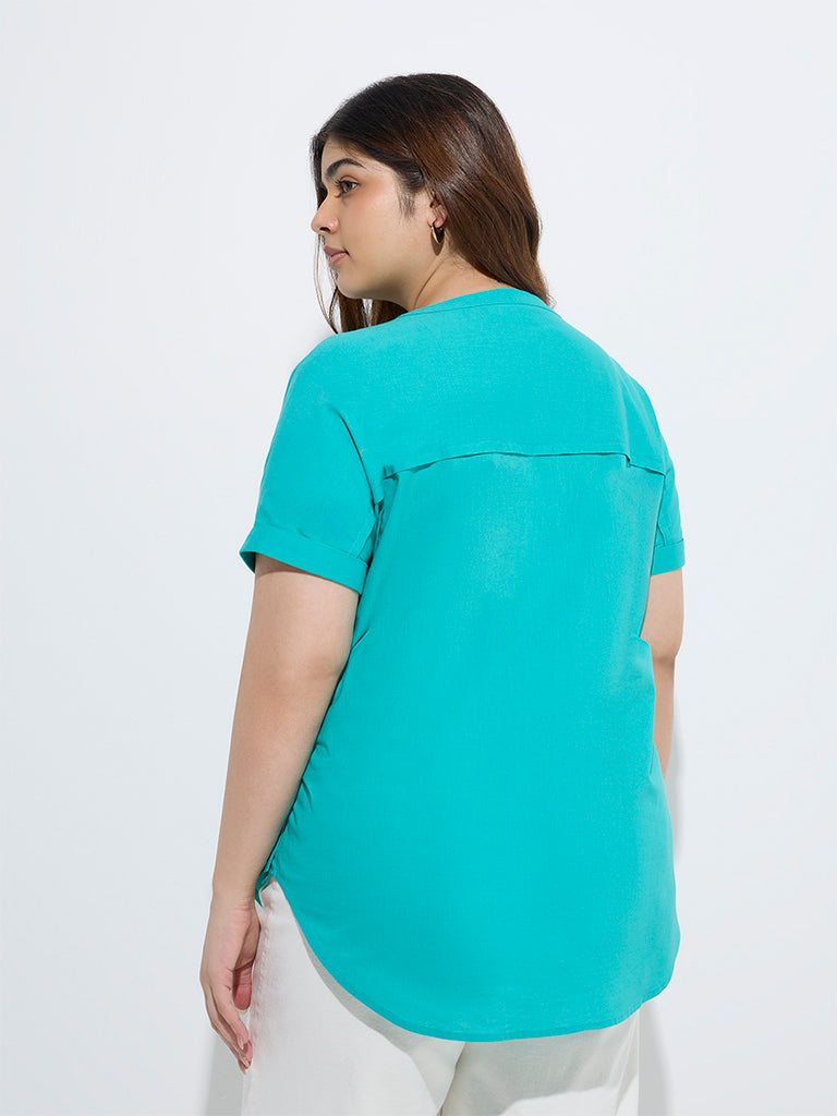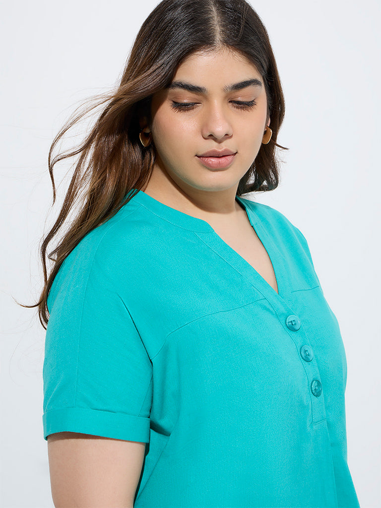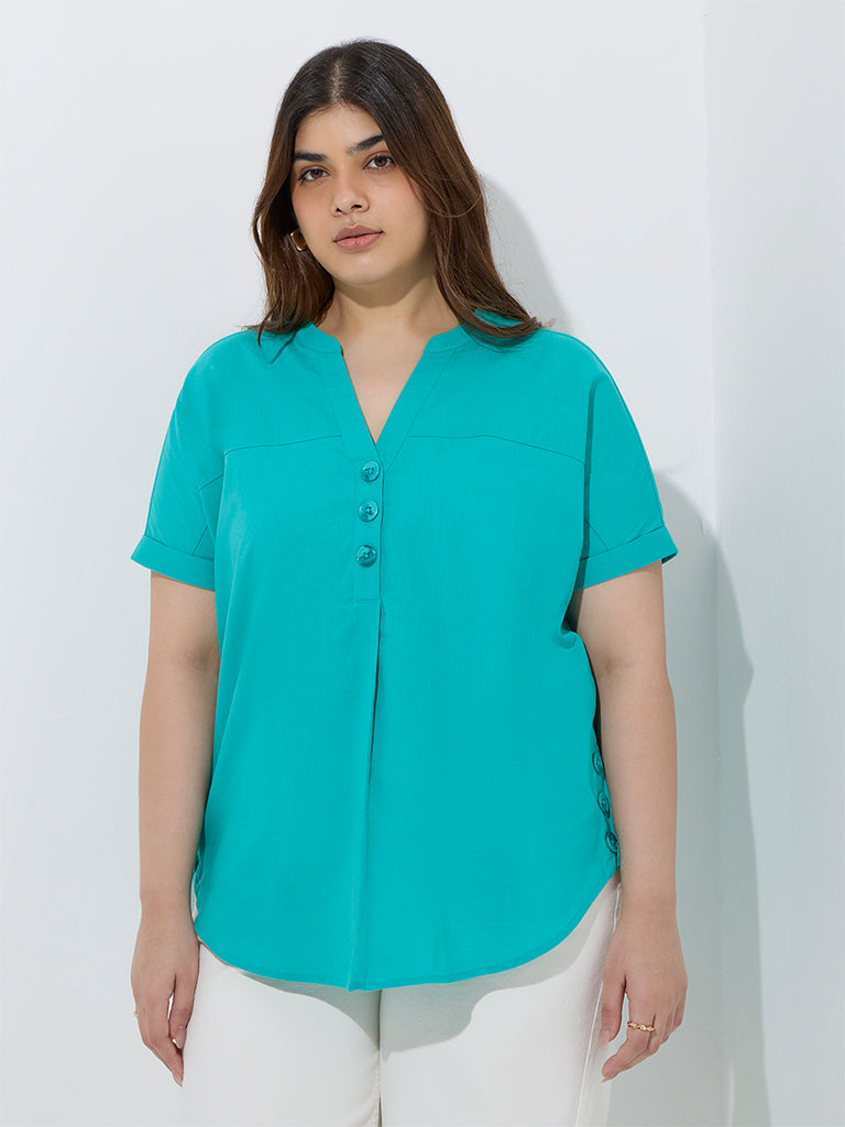 Gia presents this aqua blouse crafted from pure cotton for a soft. breathable feel. It features a mandarin neckline leading to a three-button placket. while the dolman sleeves are finished with upturned hems for a relaxed yet refined touch.