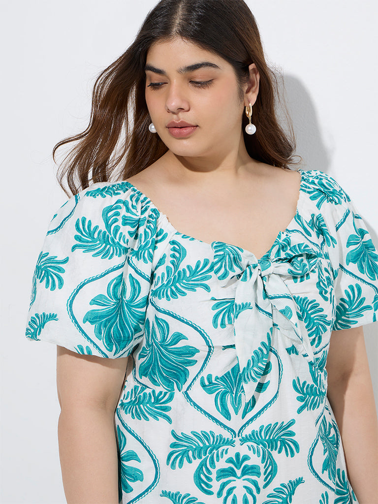 This white A-line dress from Gia is elevated with an aqua tropical print for a refreshing summer vibe. Made from quality fabric. it features a V-neck. puffed sleeves. a knot design on the bodice. and a smocked back for added comfort. Side pockets complete the look with a practical touch.