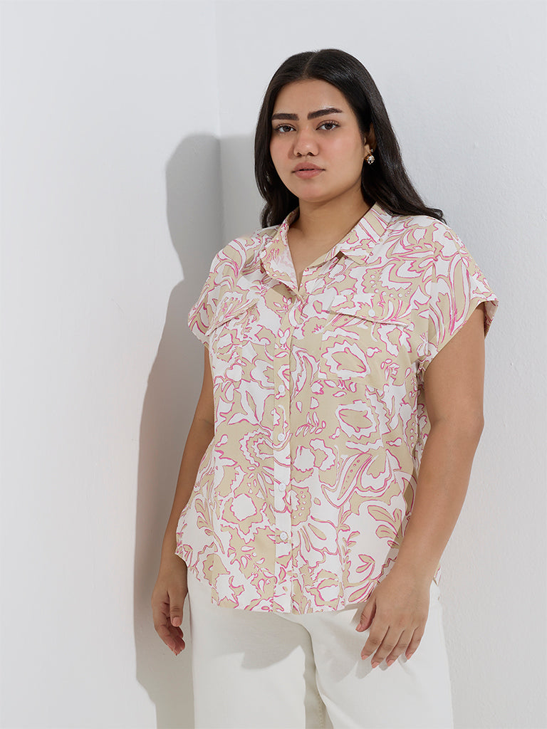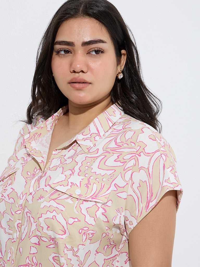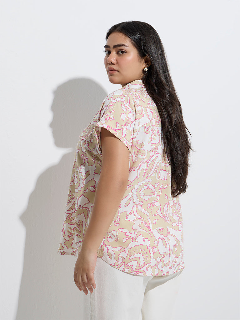 This beige shirt from Gia is woven from a breathable fabric and adorned with abstract motifs throughout. Featuring a collar that extends into a button placket. relaxed dolman sleeves. and two imitation patch pockets. it balances comfort with understated style.