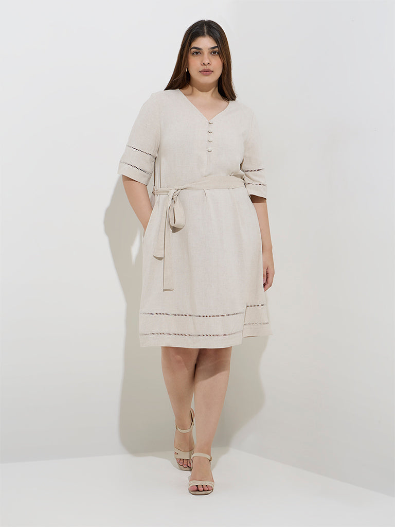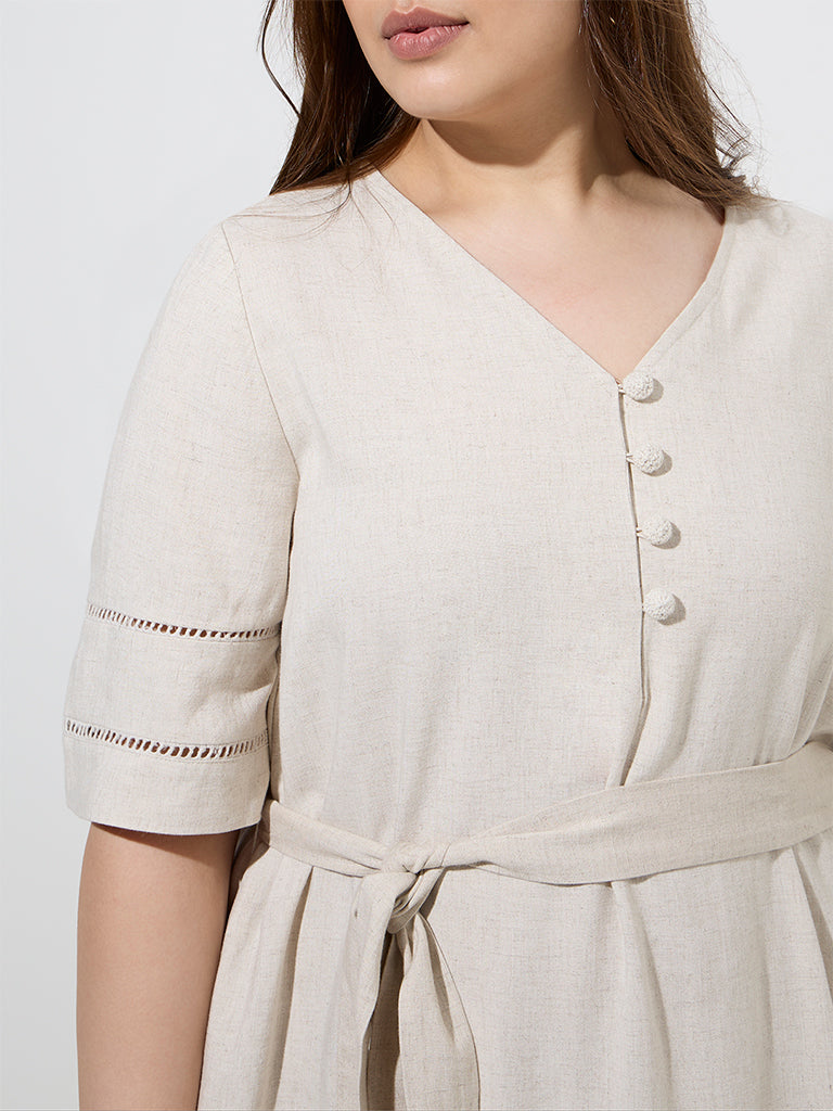 Spun from a sumptuous cotton-linen blend. this beige dress from Gia is tailored in a breezy A-line silhouette. Designed with a V-neck and half sleeves. it features functional side pockets for added ease. while a detachable belt offers a customizable fit.