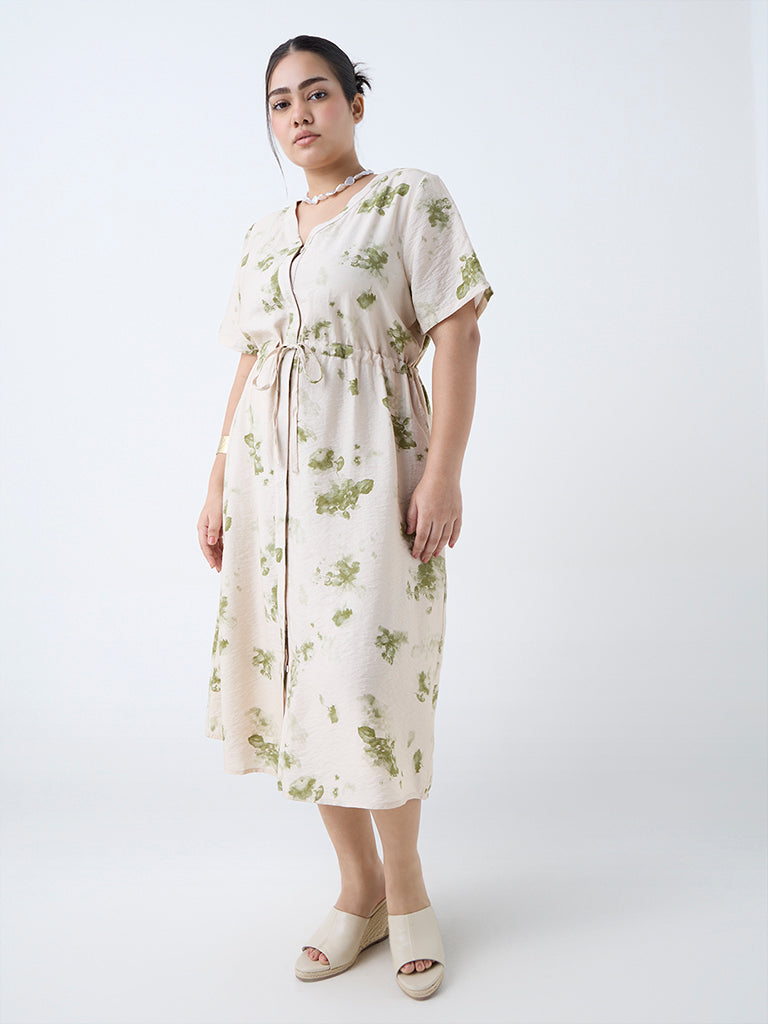 Enliven your daytime assortment with this beige dress from Gia. adorned with floral motifs for feminine charm. The V-neck extends into a concealed button placket. while adjustable drawstrings at the waist create a flattering shape. Finished with side pockets. it blends charm and practicality in equal measure.