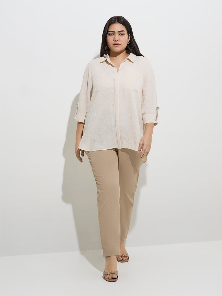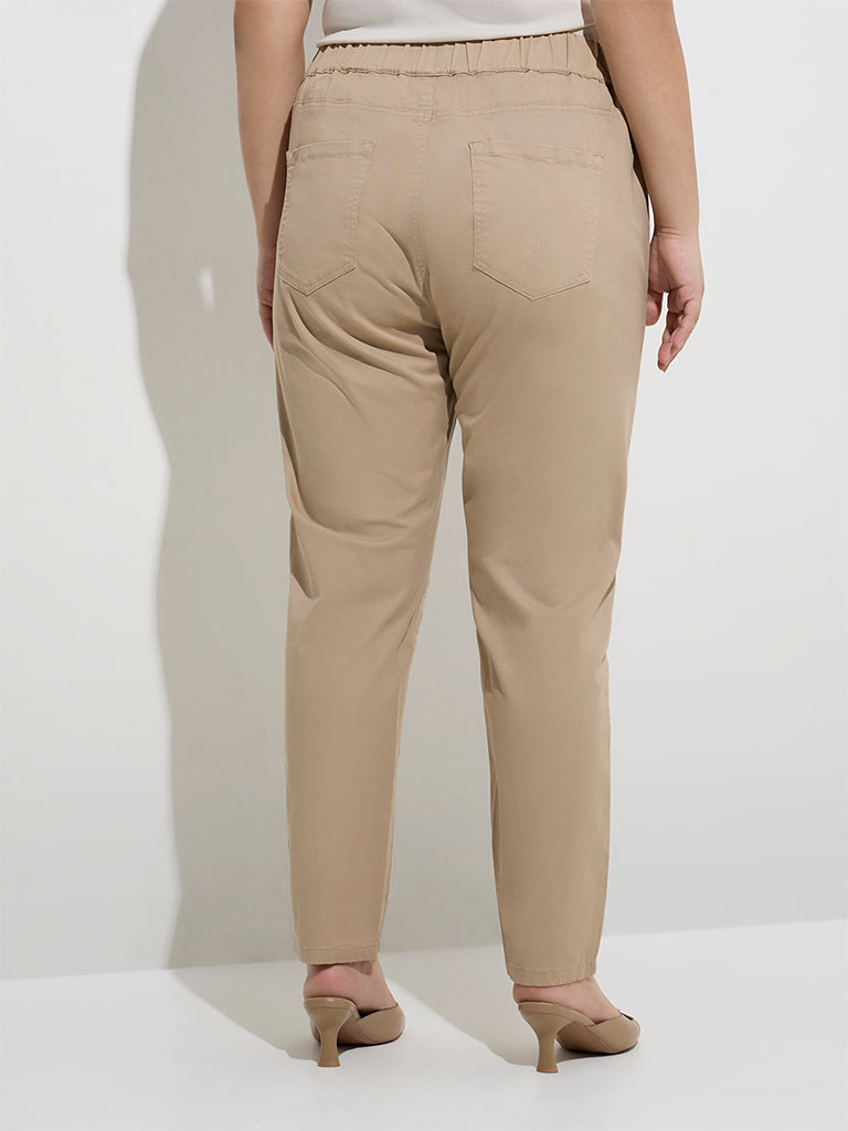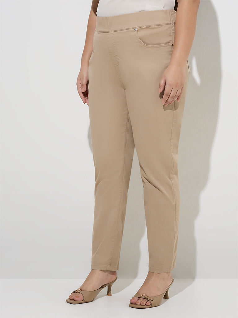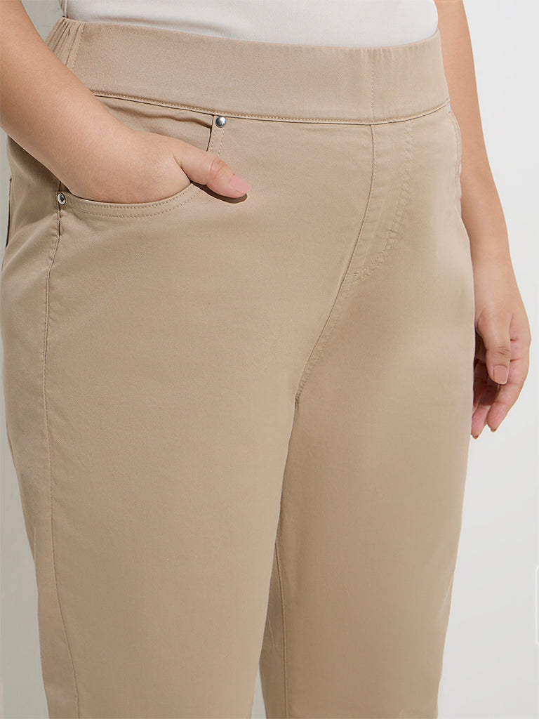 Gia introduces these beige jeggings. constructed from a soft cotton-blend fabric with added stretch for comfort. Designed in a high-rise profile. they feature a clean elasticated waistband and multiple pockets for everyday ease.