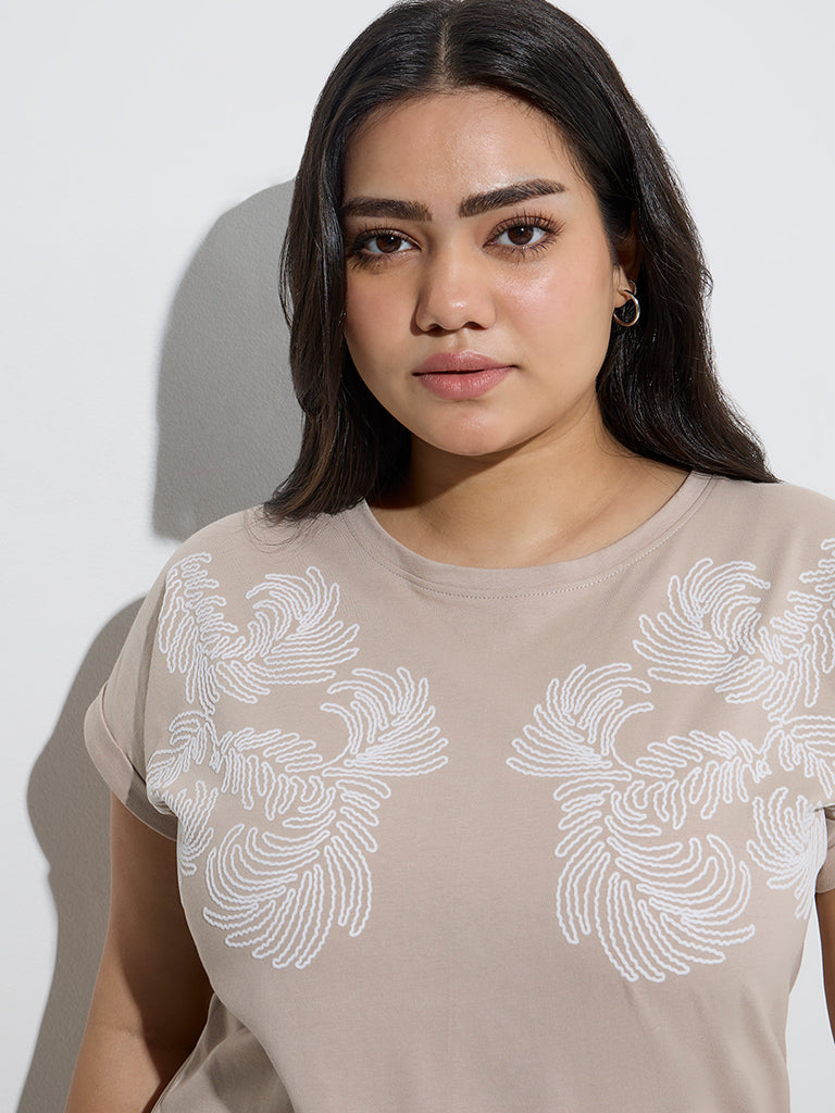 This beige t-shirt by Gia highlights delicate leaf embroidery for a subtle touch of elegance. Crafted from pure cotton for a soft feel. it features a round neck and upturned dolman sleeves.