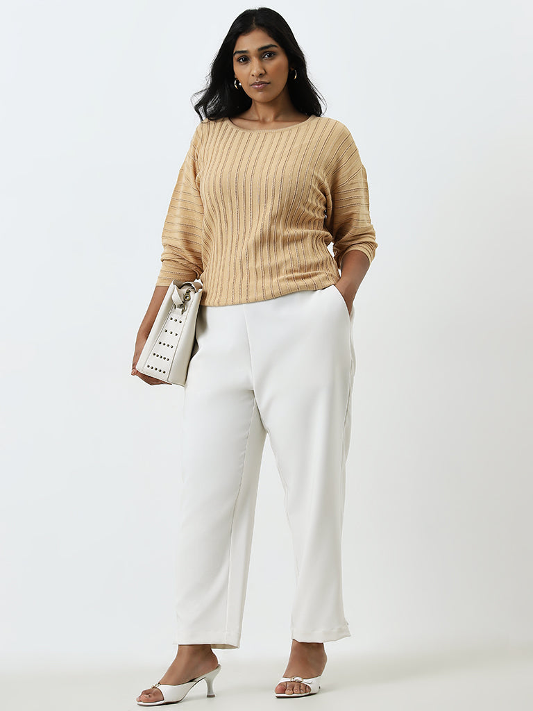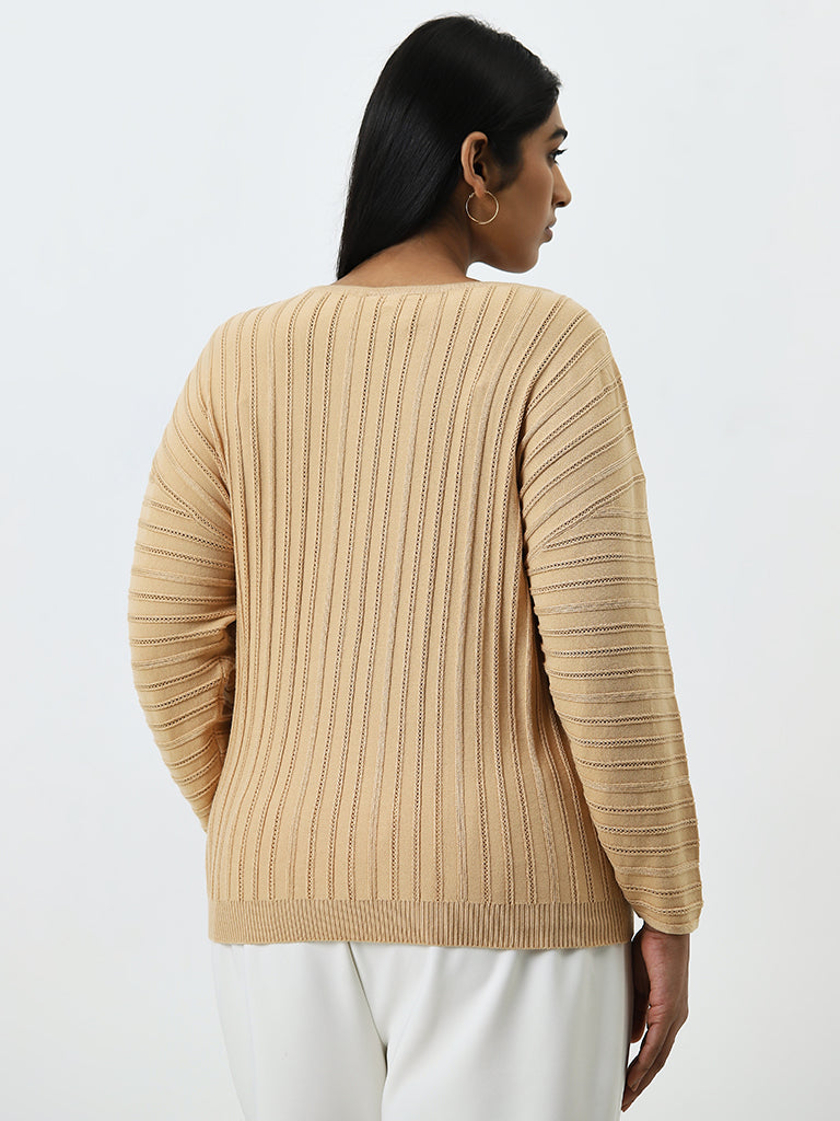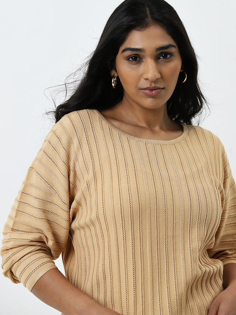 This beige sweater by Gia features a textured self-striped design. It is fabricated from a cosy and stretchable material with a round neck and full sleeves.