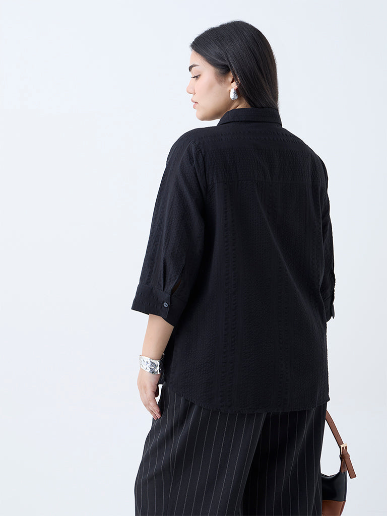 For days when sophistication is non-negotiable. reach for this black shirt from Gia. Spun from pure cotton. it is elevated with a seersucker textured finish and delicate floral embroidery for a feminine touch. A classic collar and button placket keep the look polished. while three-quarter sleeves add versatility.