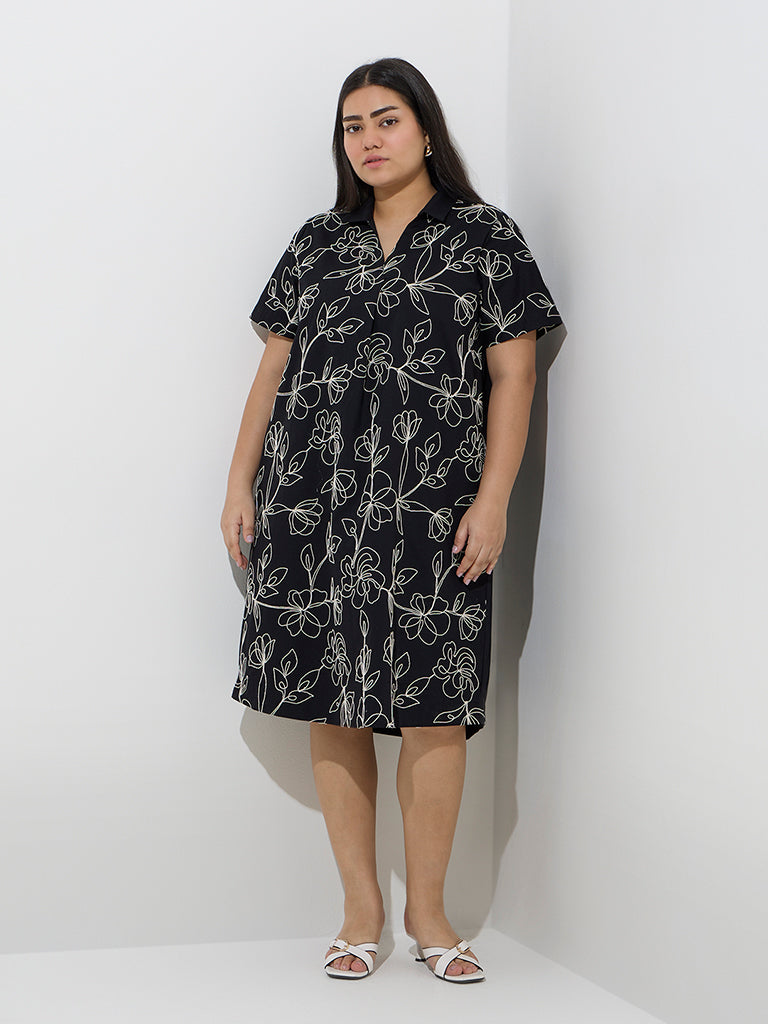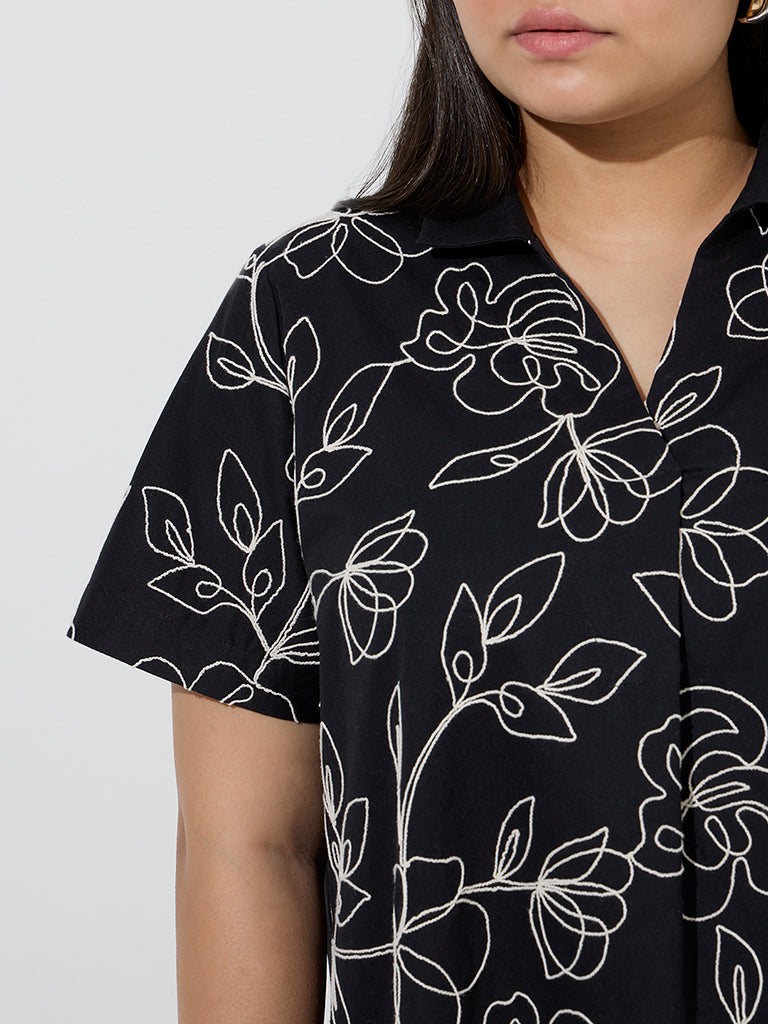 Gia introduces this black dress exhibiting striking floral embroidered patterns. sculpted in an A-line frame. This pure cotton garment is styled with a spread collar that transitions to a V-neck and finished with half sleeves. offering a chic selection for both casual and dressy occasions.