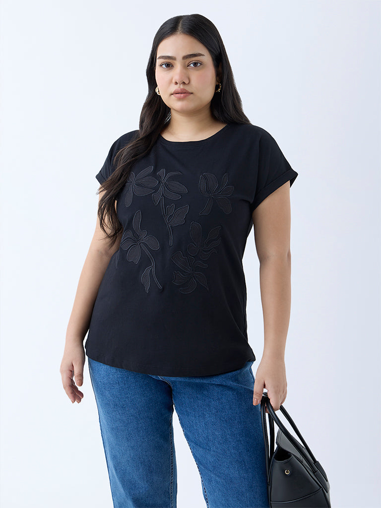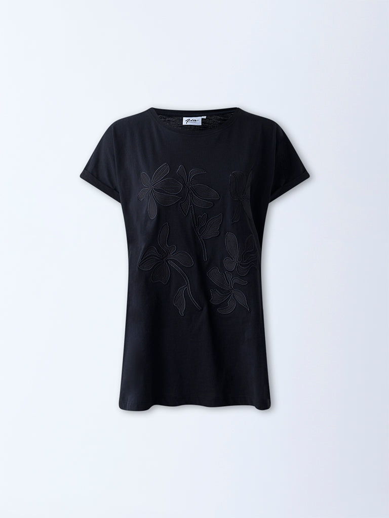 This black tee by Gia is crafted from pure cotton for long lasting comfort. Flaunting graceful floral embroidery. it’s styled with a classic round neck and short sleeves. adding a feminine touch to a casual essential.