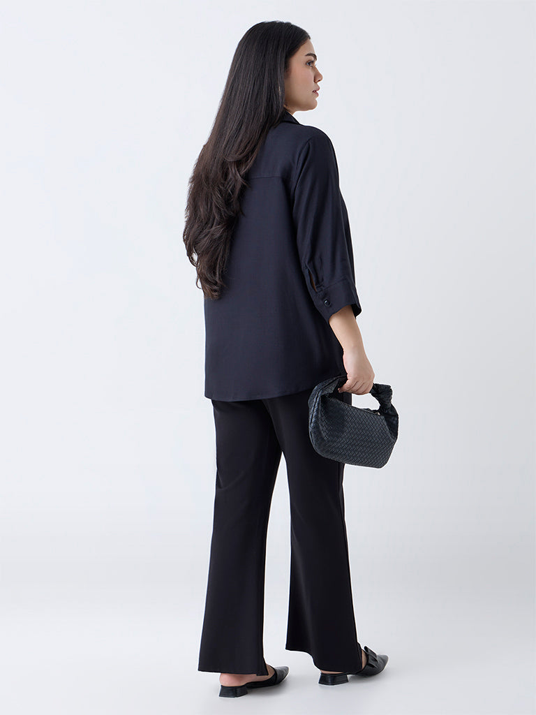 Elevate your wardrobe with this black shirt from Gia. beautifully accented with delicate floral embroidery. Designed with a chic notched collar that flows into a button-down front and three-quarter sleeves. it combines timeless elegance with modern sophistication.
