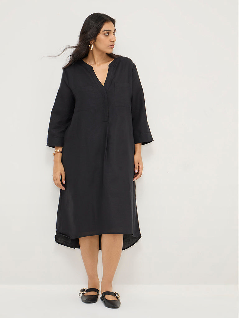 This black dress by Gia is carved in a high-low silhouette. Made with quality fabric. it features a notched collar leading to a concealed button down placket and three-fourth sleeves. The garment is completed with side pockets.