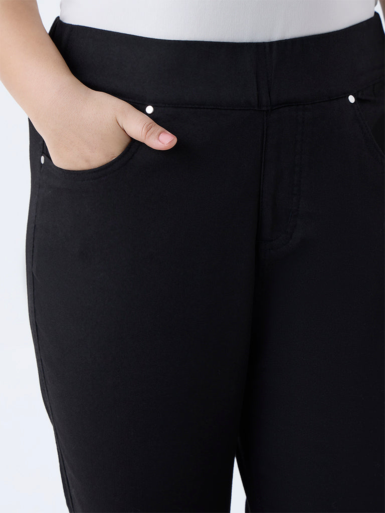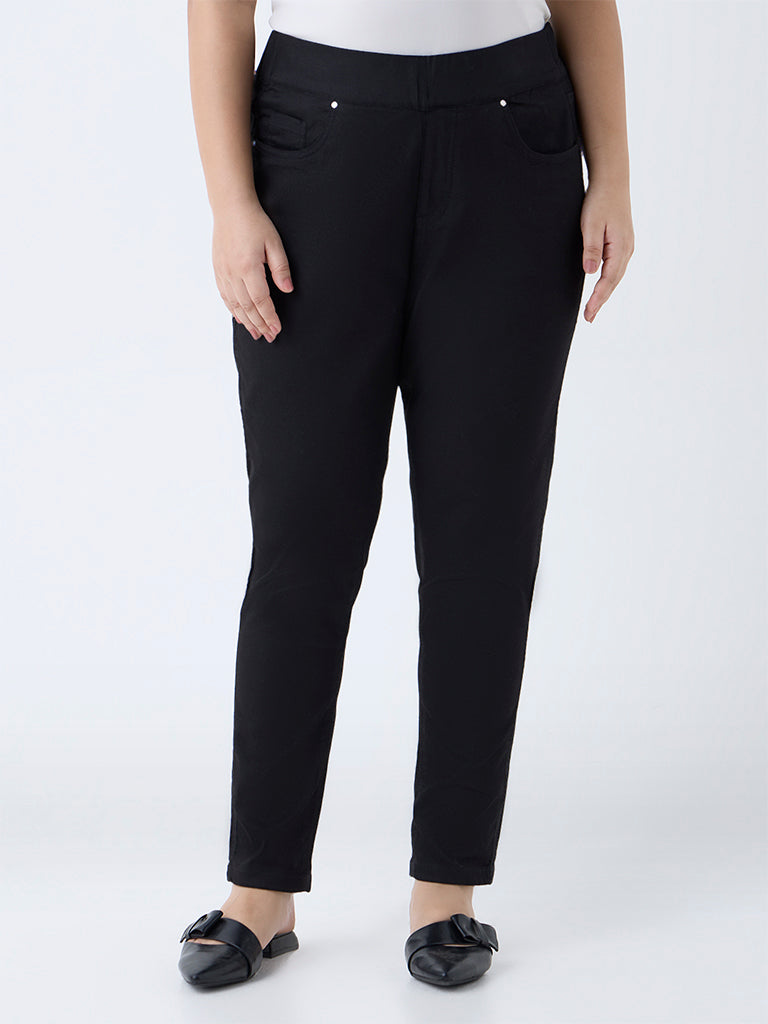 Enhance your wardrobe foundation with these black solid jeggings from Gia. Cut from a stretch-infused fabric. they sculpt a streamlined silhouette while ensuring all-day ease. The smooth elastic waistband delivers a clean finish. and multiple pockets lend a practical edge.