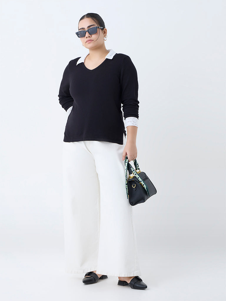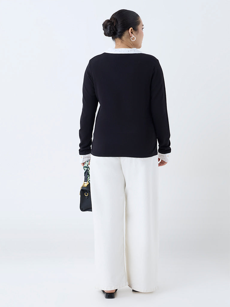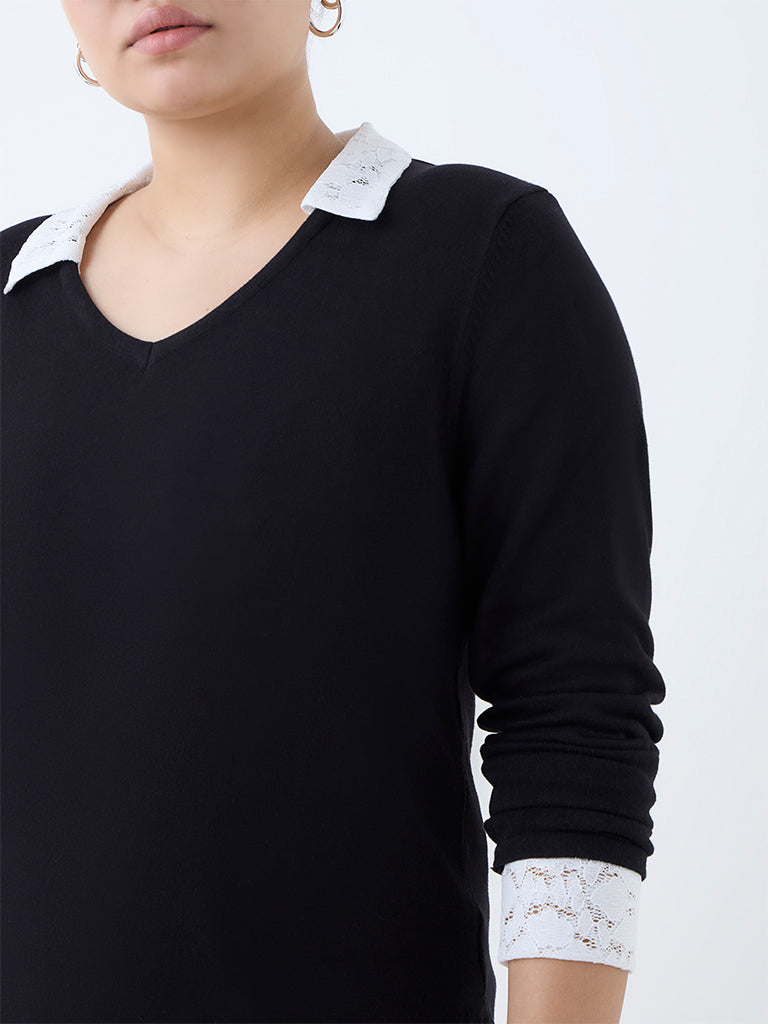 This black sweater from Gia is designed to take you from desk to dinner with quiet sophistication. Defined by its lace-detailed V-neck collar and cuffs. it is crafted from quality fabric and finished with full sleeves.