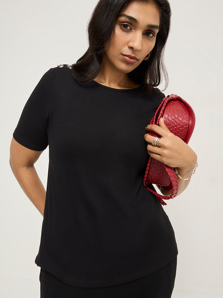Gia presents this black t-shirt featuring ribbed texture and minimal button-detailing. Made with quality fabric. it carries a round neck and half sleeves.