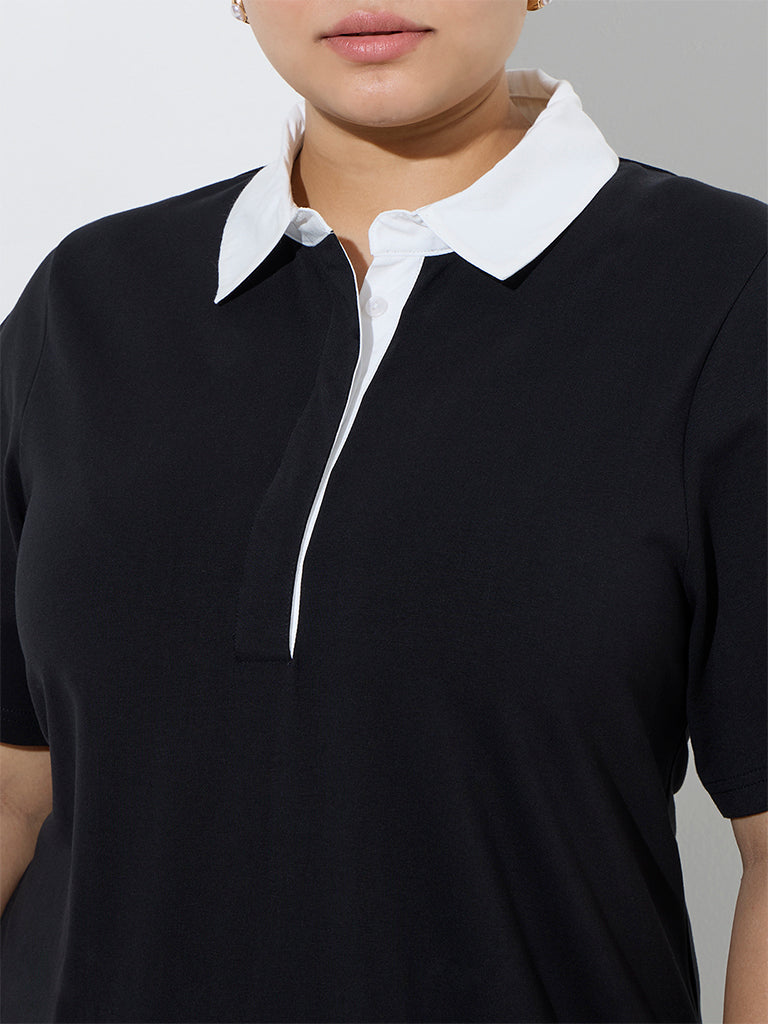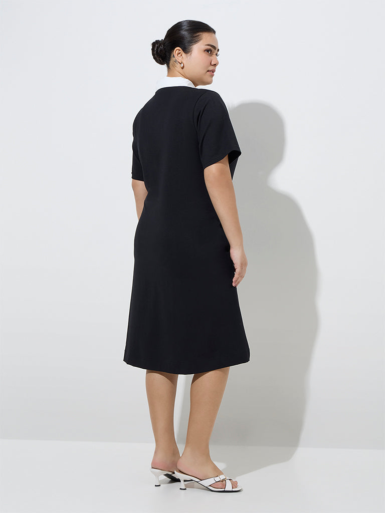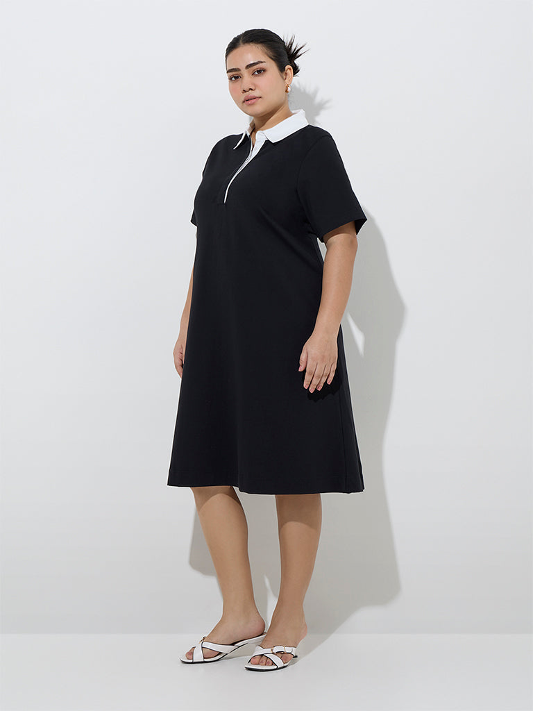 This black a line dress from Gia is designed in a minimalistic profile. Milled from a cotton-rich fabric with a hint of stretch. it includes a contrast collar with a concealed button placket and half sleeves.