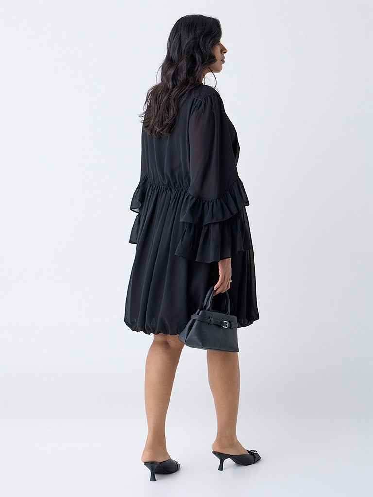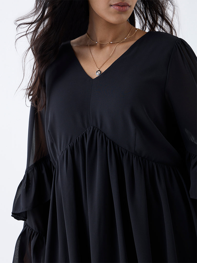 Gia presents this black dress crafted in a balloon silhouette for a fluid. airy drape. It features a V-neck and ruffled flute sleeves that add dimension to the design. Spun from breathable fabric. it delivers comfort with a polished appeal.