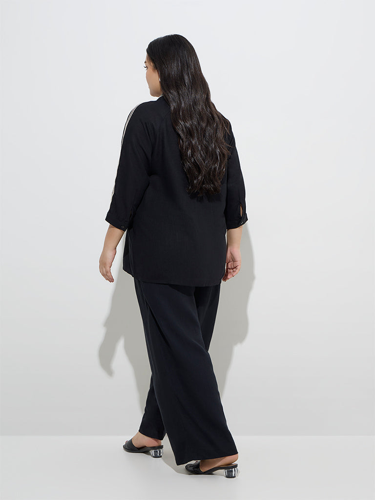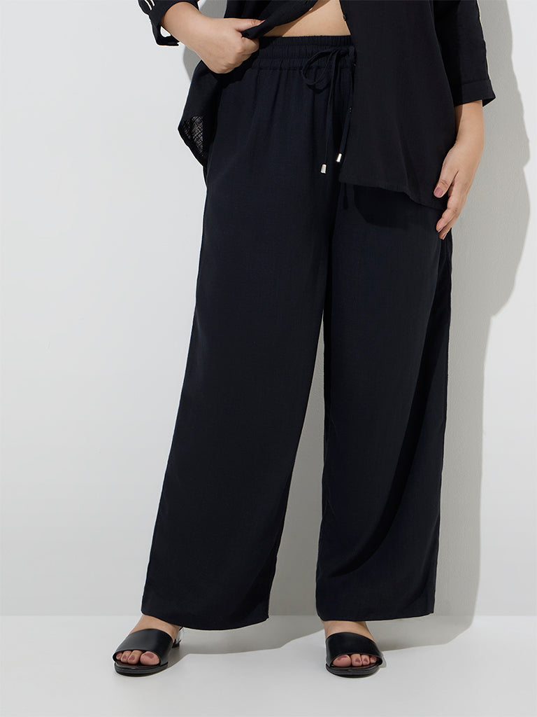 Gia presents these black high-rise pants. crafted from a rich linen blend for a breezy feel. Designed with a smooth elastic waistband. adjustable silver-toned drawstrings. and side pockets. they offer both comfort and style.