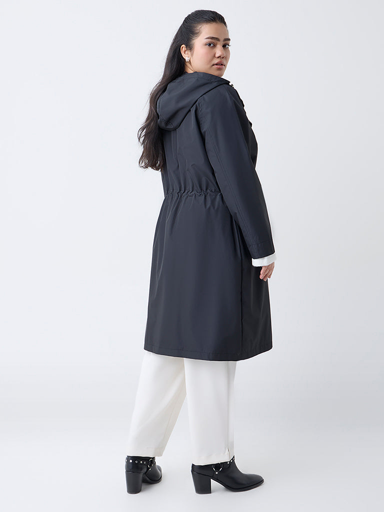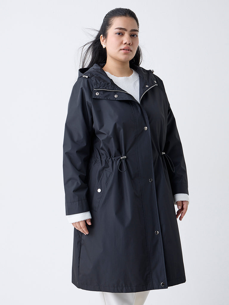 Make chilly days feel polished with this black long coat from Gia. Designed with a drawstring hood and a full zip hidden beneath a golden metallic button placket. it keeps warmth locked in while elevating the look. The elasticated waist lends gentle definition. and pockets offer everyday utility.
