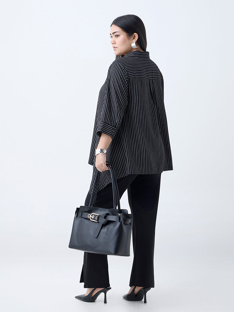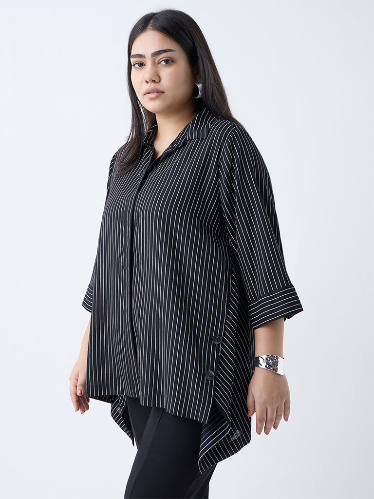 Timeless style meets everyday ease in this black striped blouse from Gia. Tailored from a sumptuous linen-blend fabric. it’s detailed with a classic collar. three-quarter sleeves. and a concealed placket for a polished finish.