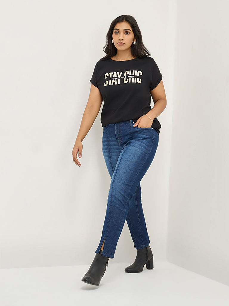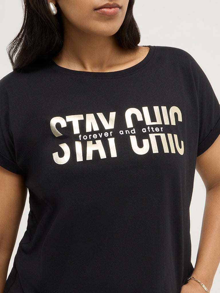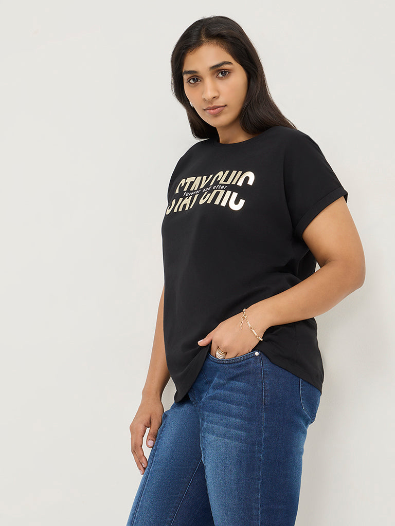 Gia launches this black t-shirt styled with text prints. The pure cotton casual wear features a round neck and short sleeves.