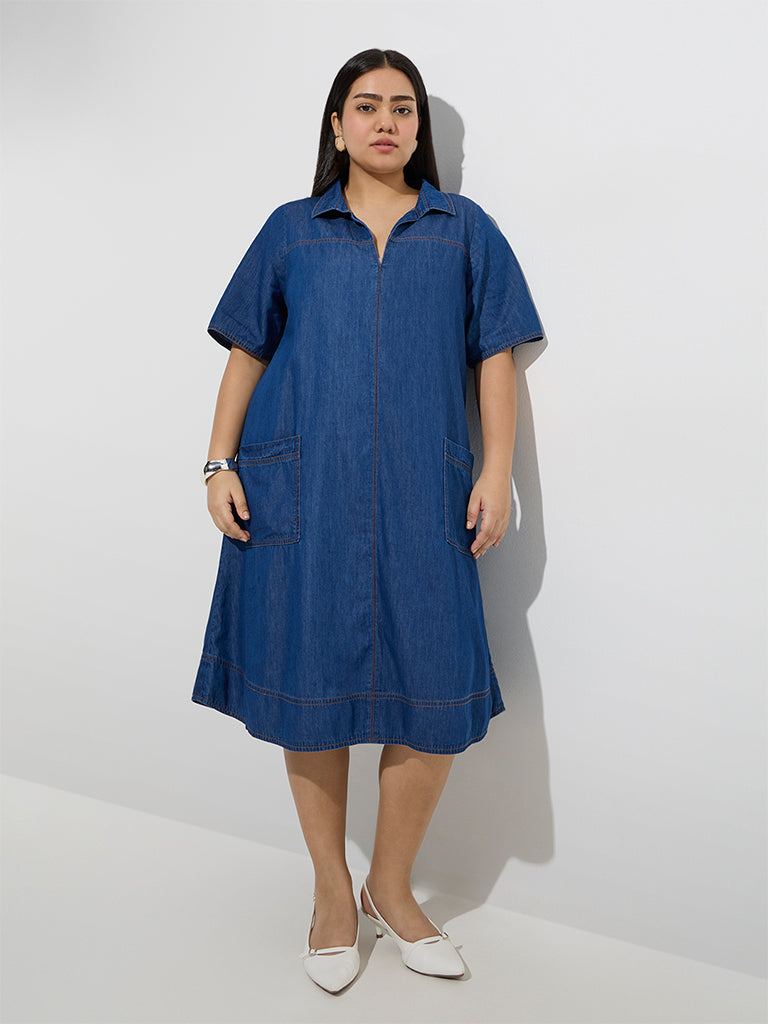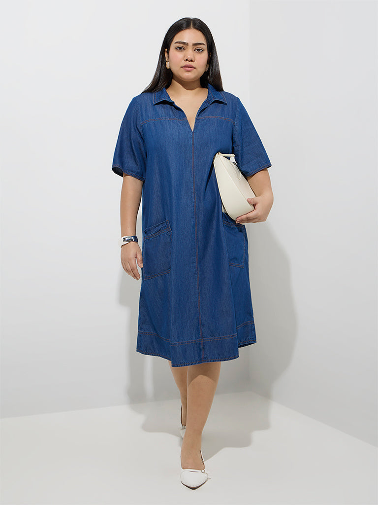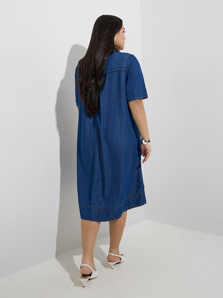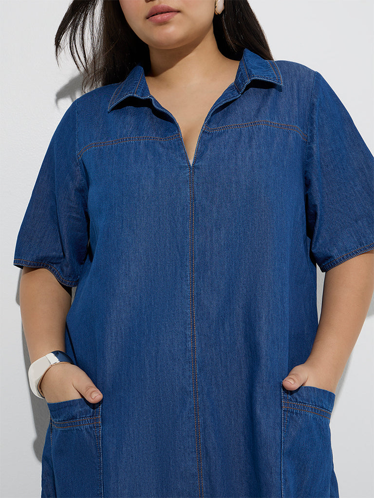 This blue denim dress from Gia blends timeless style with everyday ease. Spun from pure cotton for superior comfort. it’s cut in a flattering A-line silhouette that moves with you. The V-neck collar and half sleeves lend an effortless vibe. while the twin flap pockets add a touch of utility without compromising on style.