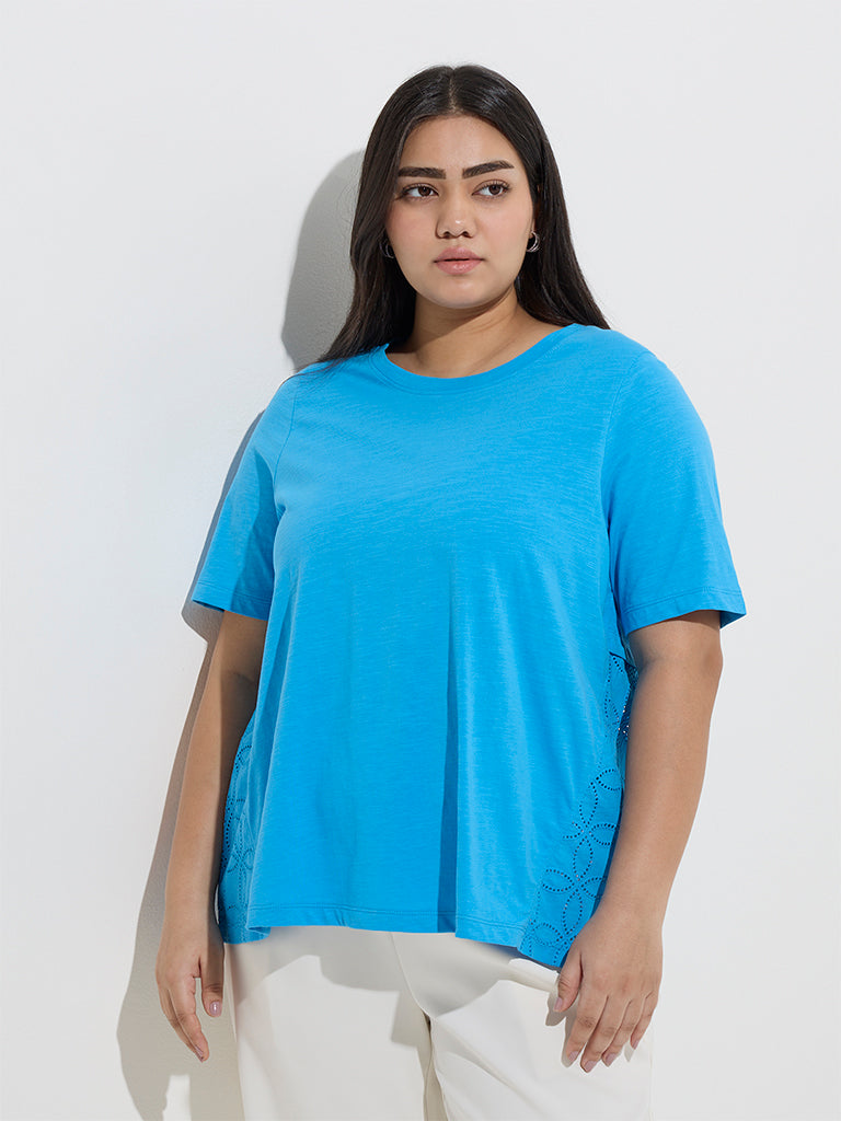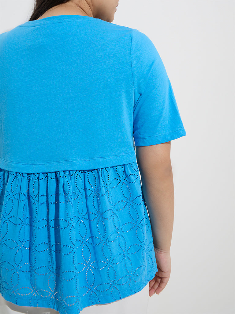 This blue top from Gia spotlights an intricate schiffli pattern at the back. adding a delicate touch. Crafted from pure cotton. it offers a lightweight feel. while the round neck and half sleeves ensure effortless comfort.