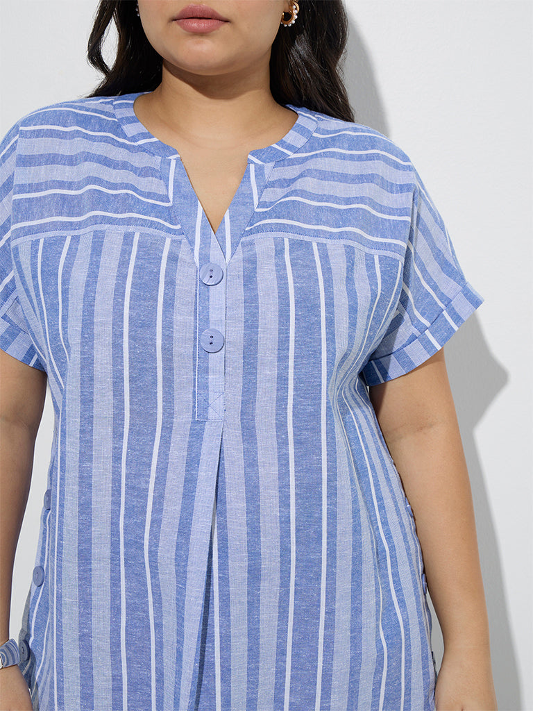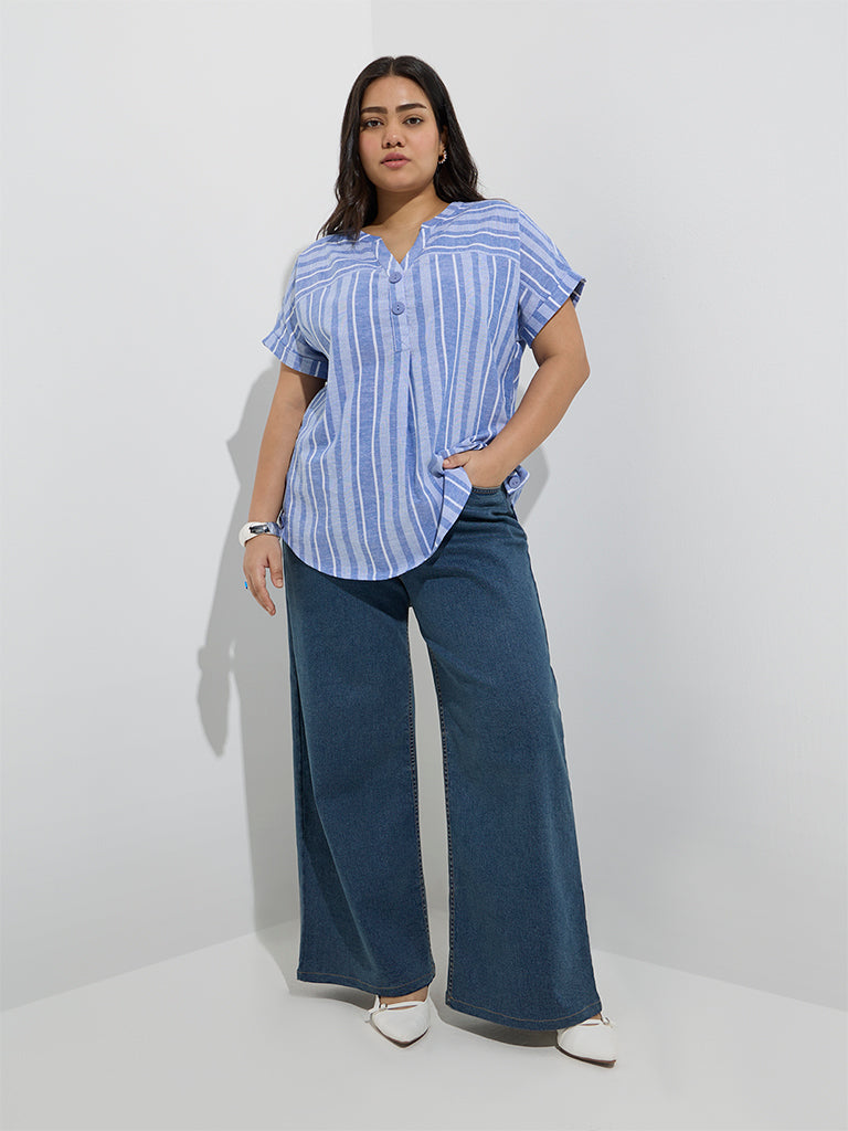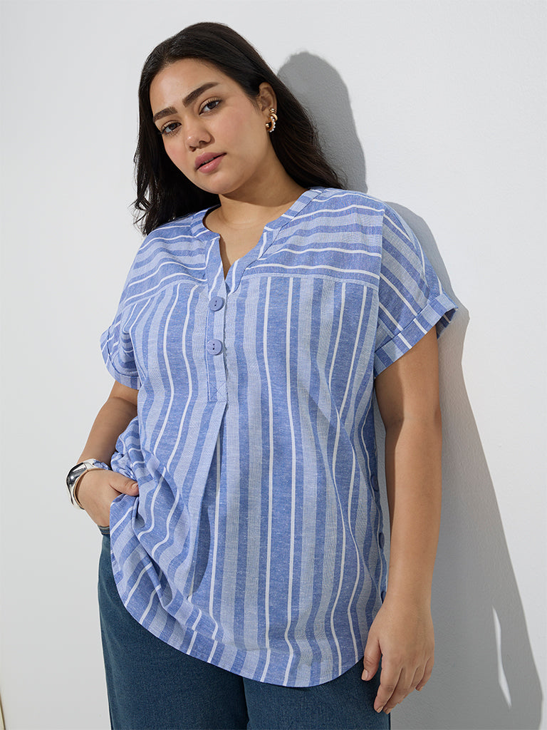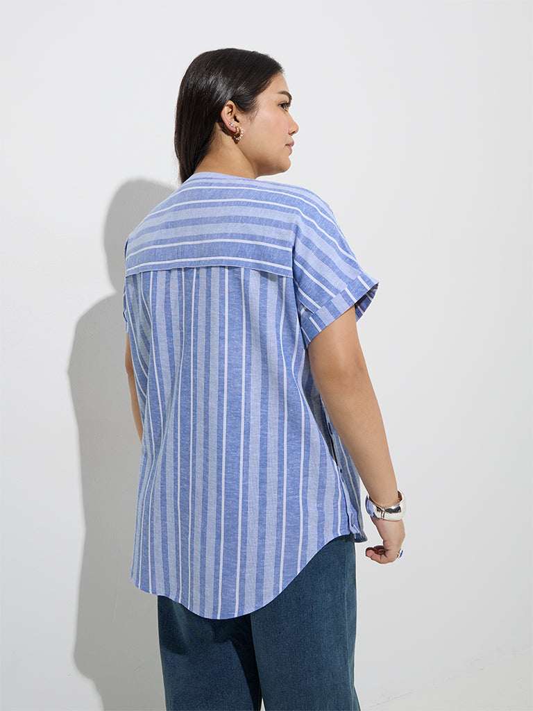 This blue blouse from Gia brings a fresh take on timeless stripes with its clean lines and breezy silhouette. Tailored from a soft cotton-linen blend for a breathable feel. it features a mandarin neck that flows into a neat two-button placket and upturned dolman sleeves.