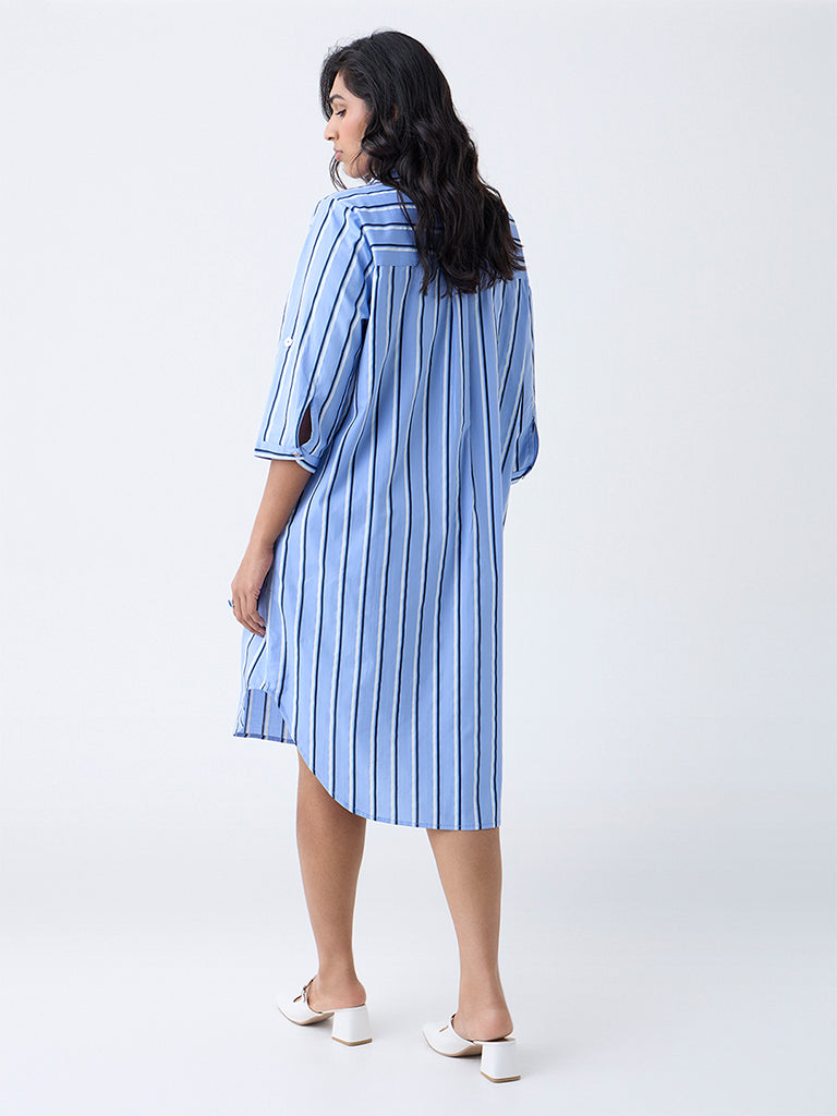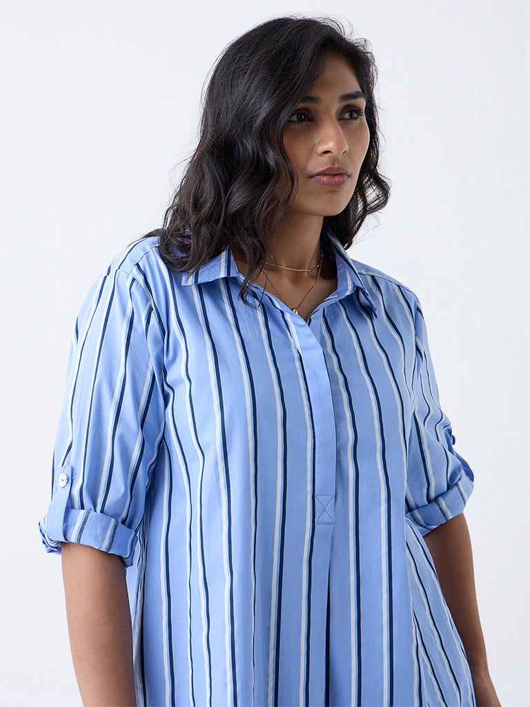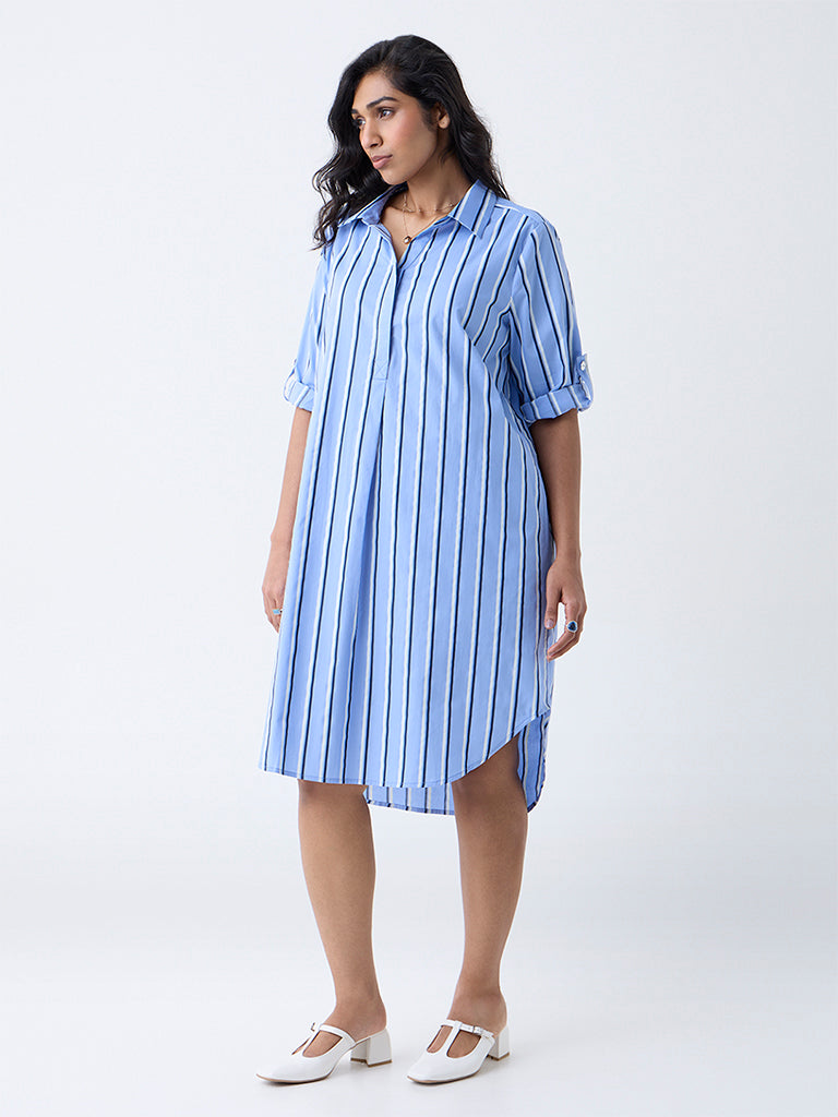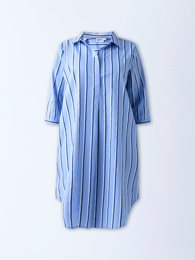 Gia launches this blue shirt dress showcasing classic stripe patterns for a timeless appeal. Styled with a spread collar. a short concealed button placket and three-quarter sleeves. it offers a refined structure. Crafted from pure cotton and finished with side pockets. it brings both comfort and practicality to everyday dressing.