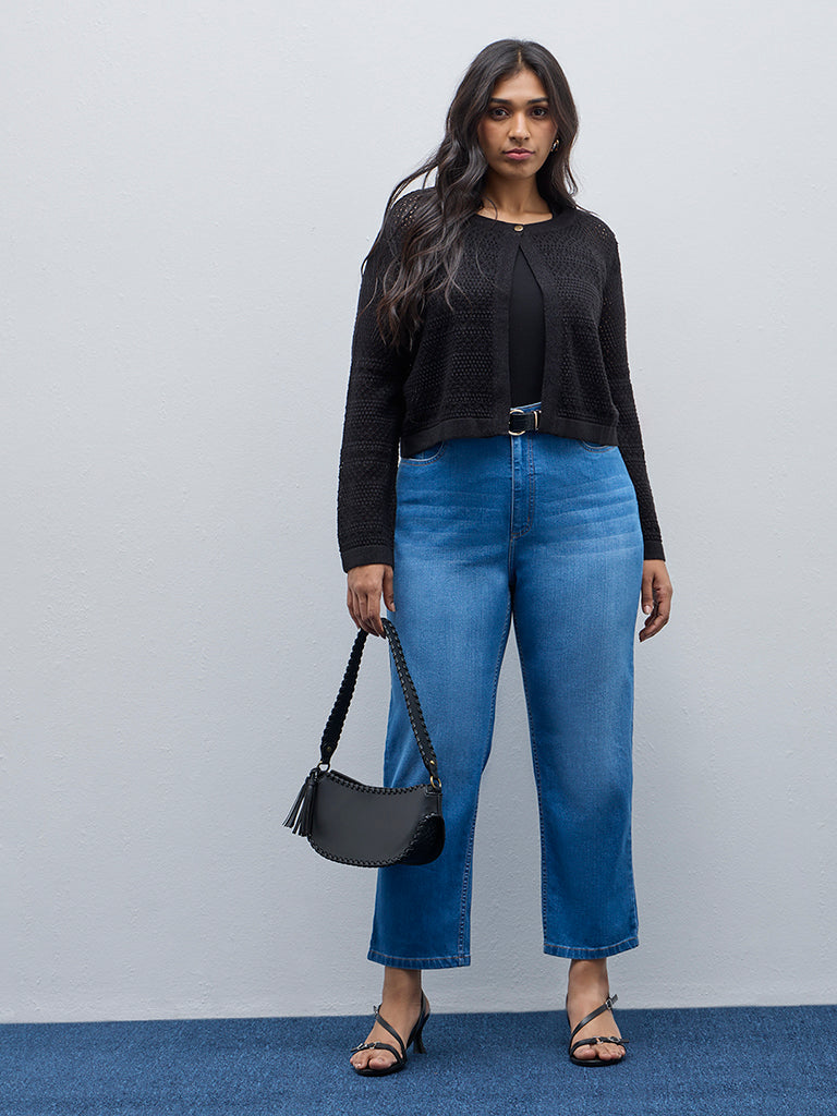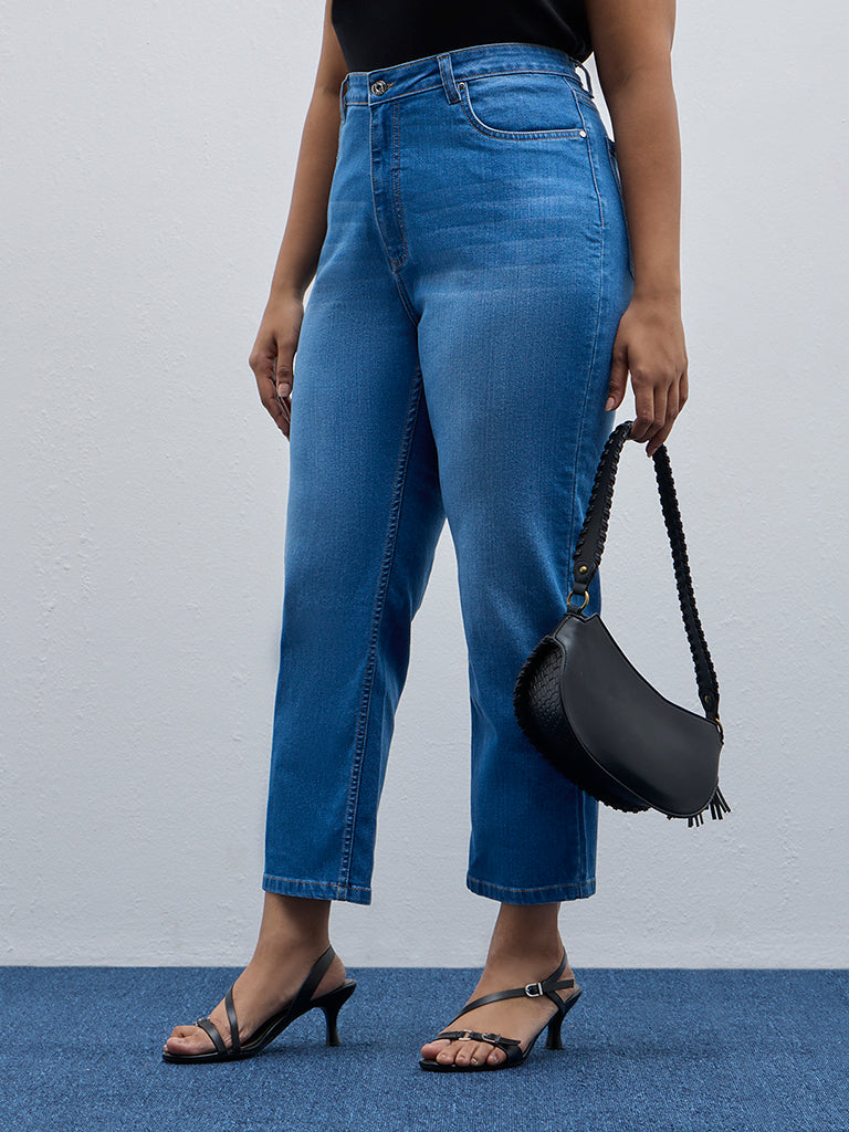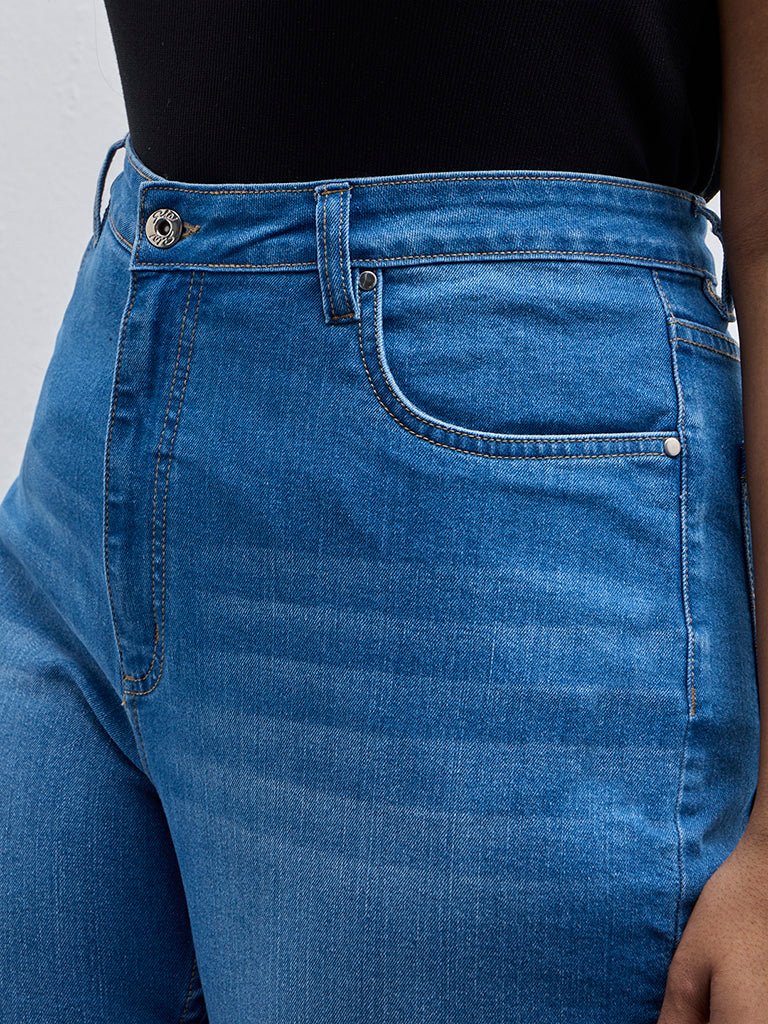 Gia launches these blue denim jeans in a cotton-rich blend. The high-rise bottom wear includes buttoned waistband. zipper fly. belt loops and multiple pockets.