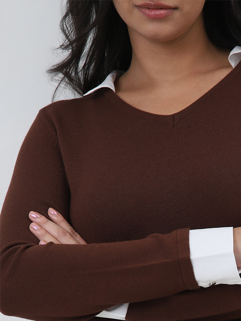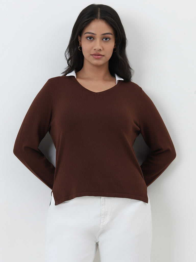 Gia presents this brown t-shirt featuring collared design attached to its v-neckline and cuffs stitched to its full sleeves. Made with soft and breathable fabric. it makes for the perfect chic winter wear.