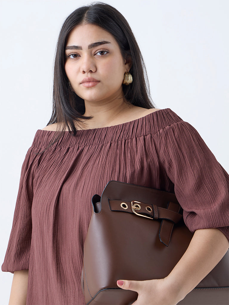 Gia Brown Crinkle Textured Off-Shoulder Top