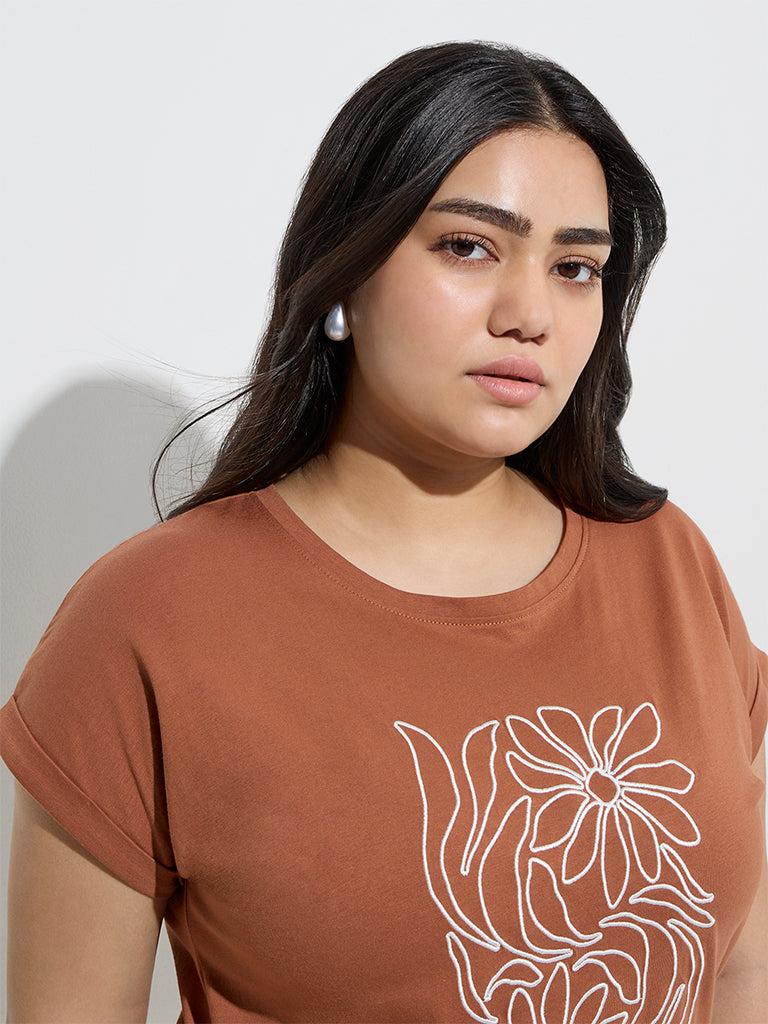 Gia Brown Floral Embroidered Cotton T-Shirt