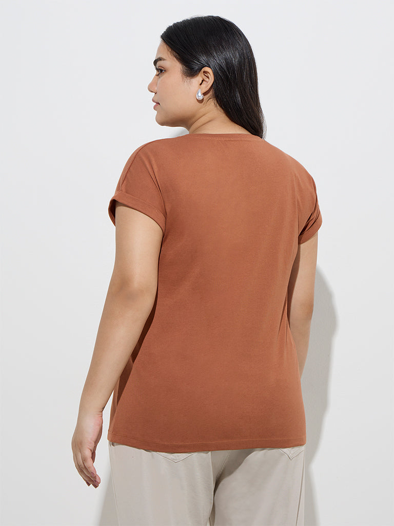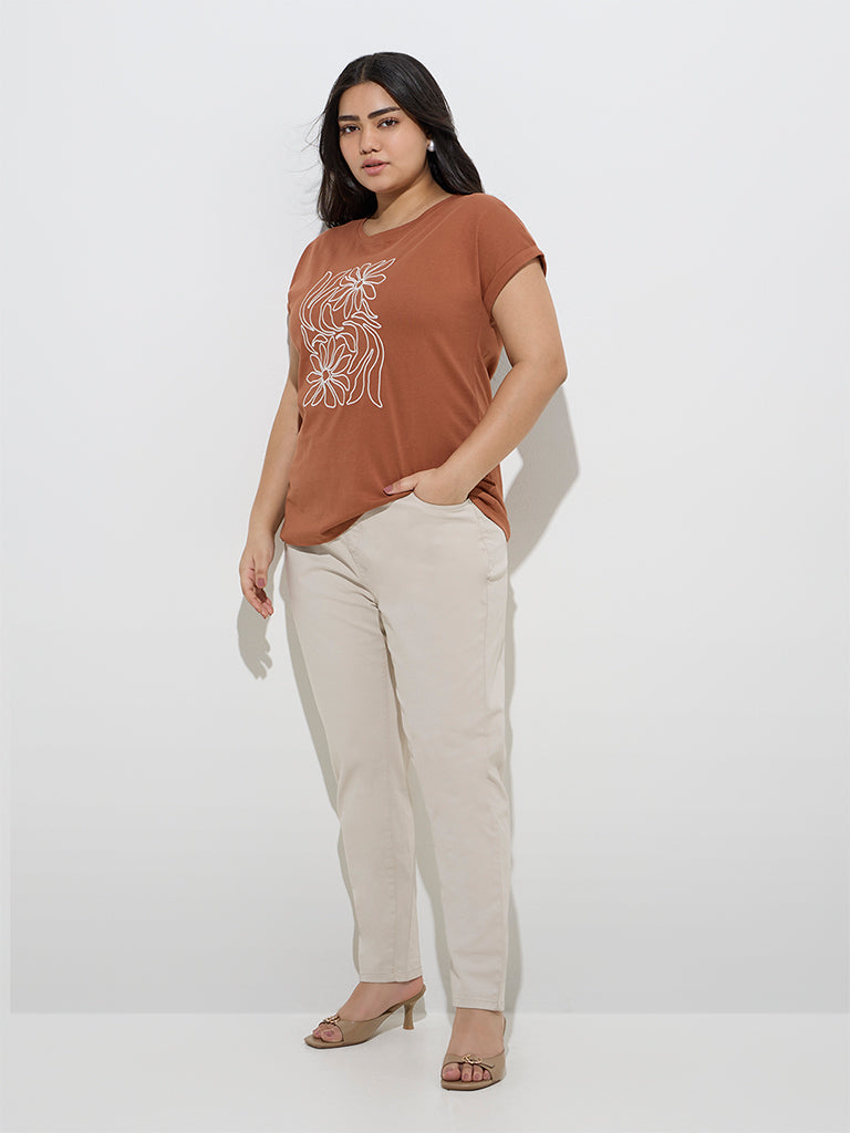 Crafted from pure cotton. this brown t-shirt from Gia by Westside offers a soft and breathable feel. It features delicate white floral embroidery. a classic round neck. and dolman sleeves with a folded hemline for a relaxed yet stylish touch.