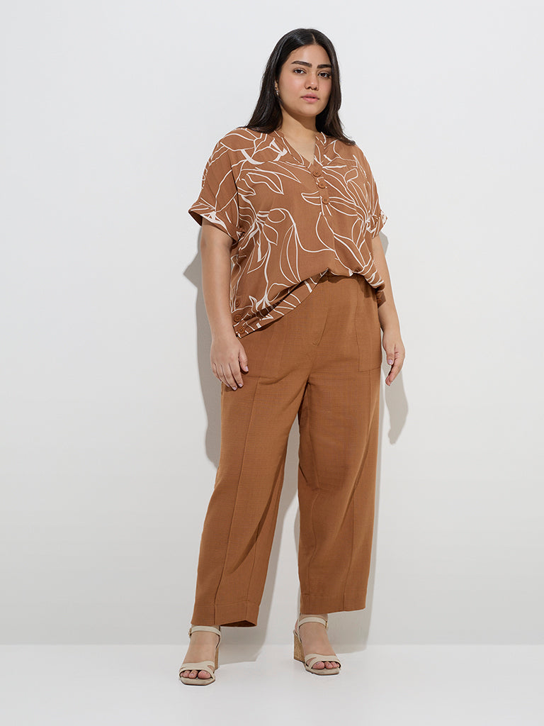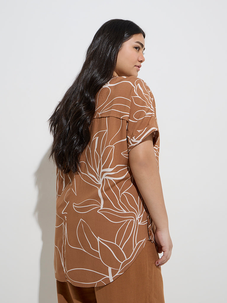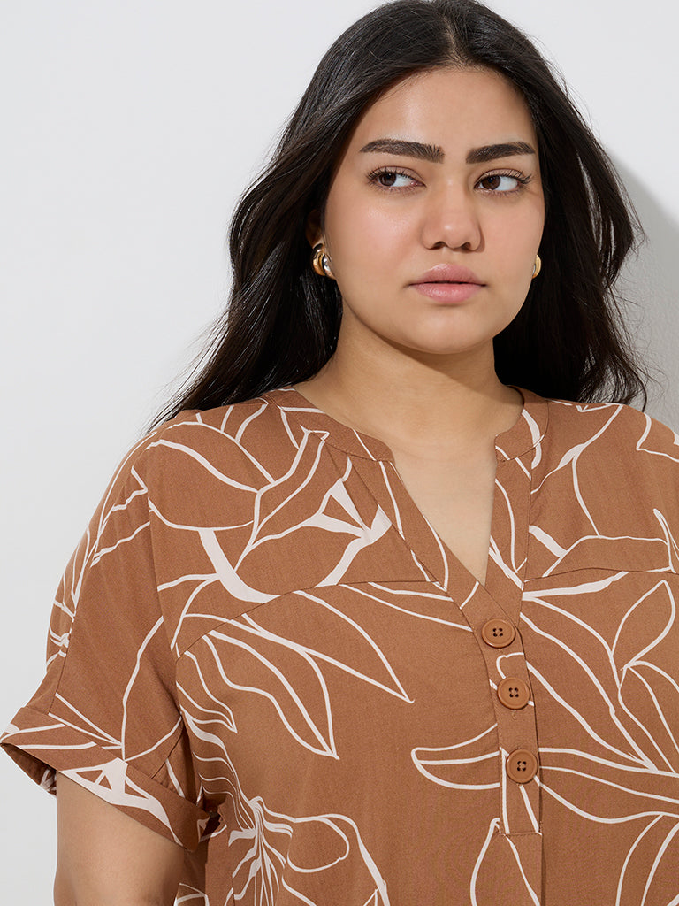 Gia introduces this brown blouse. crafted from lightweight fabric with printed patterns. Designed with a mandarin collar neck and a brief button placket. it features a high-low hemline and dolman sleeves. making it a versatile addition to your everyday casual wardrobe.